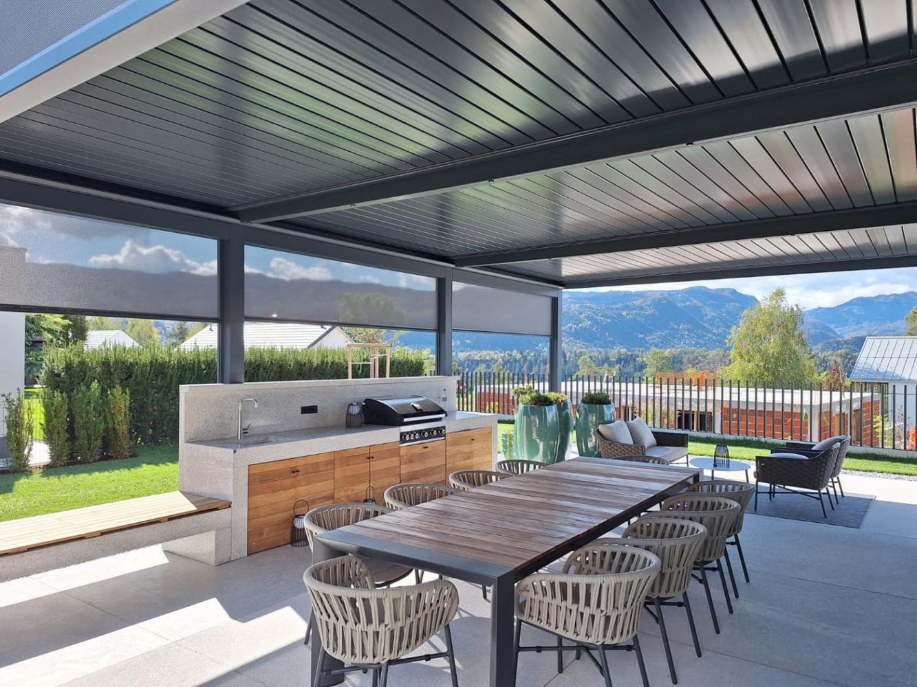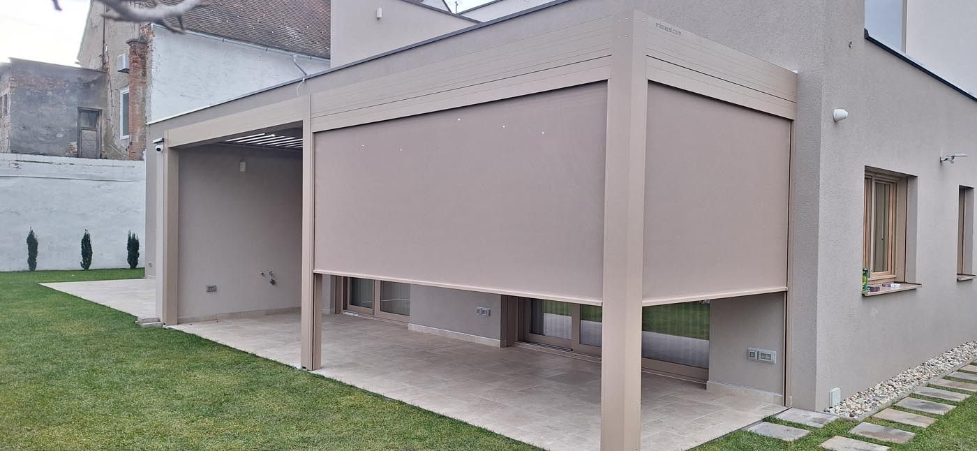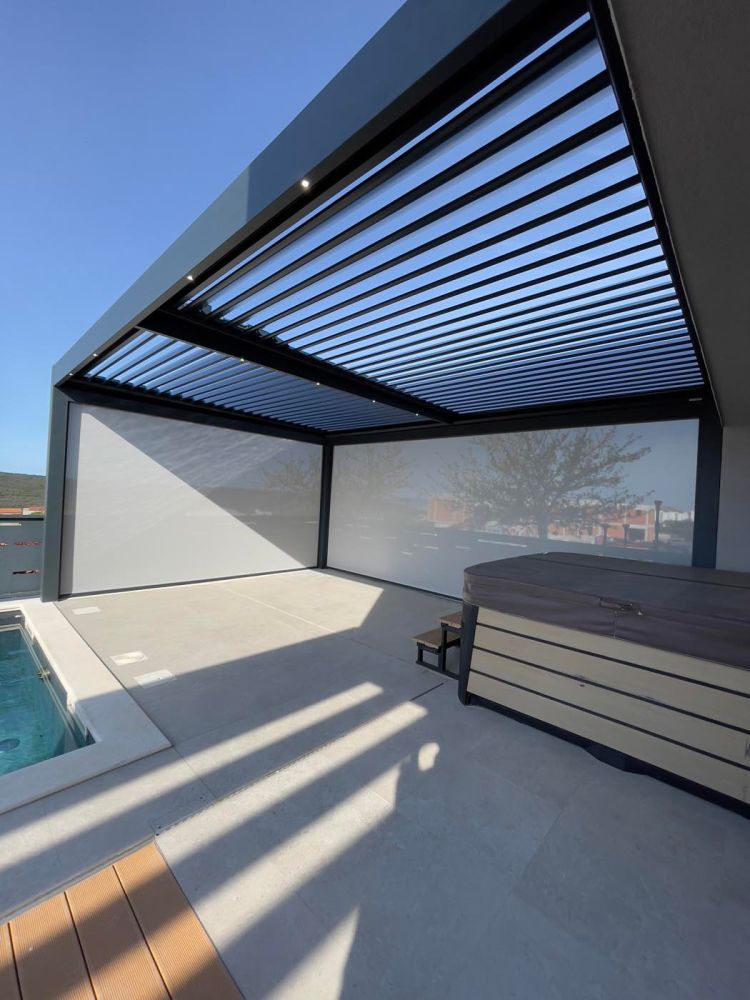 Za dodatno zaščito in udobje je pergola na treh stranicah opremljena z zip screen roloji, ki učinkovito ščitijo pred soncem, vetrom in drugimi vremenskimi vplivi ter ustvarjajo občutek zasebnosti.