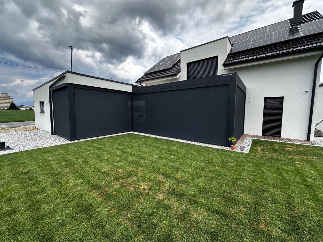 Na eni strani je dodan tudi fiksen panel v enaki antracitni barvi, ki služi kot zaščita ter estetski zaključek konstrukcije.