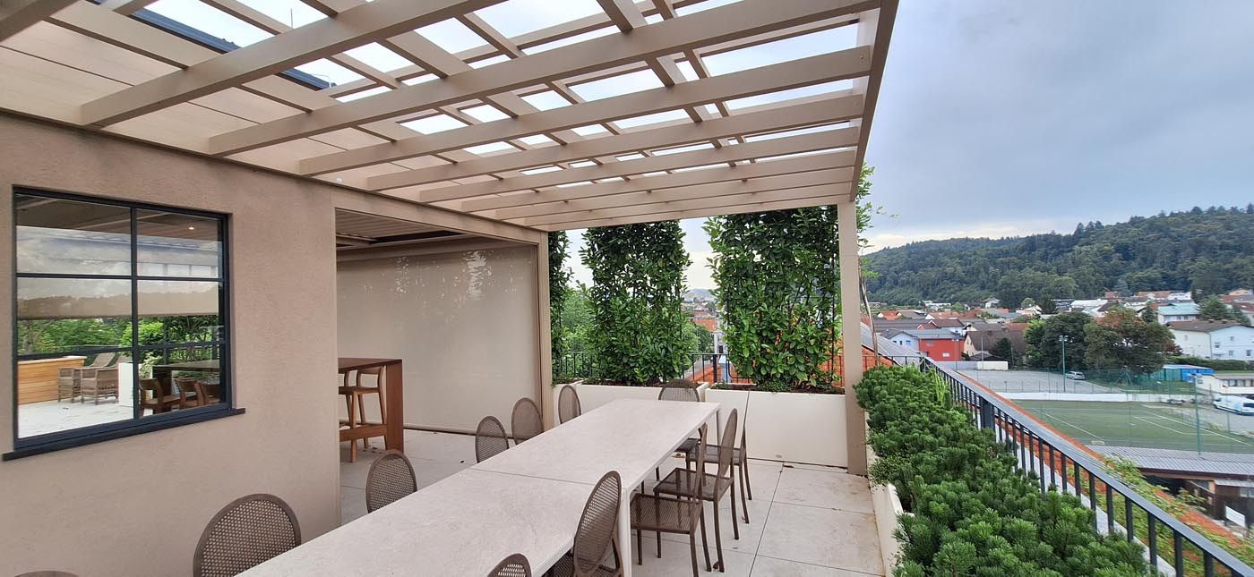 Na terasi najvišjega nadstropja bloka stoji bioklimatska pergola v elegantni kombinaciji antracitne konstrukcije (RAL 7016) in belih lamel (RAL 9010), ki se odlično zlije z arhitekturo objekta in sodobnim urbanim okoljem.