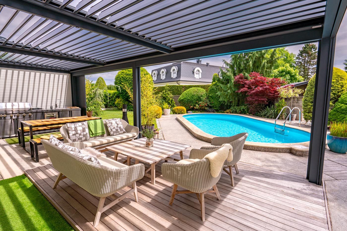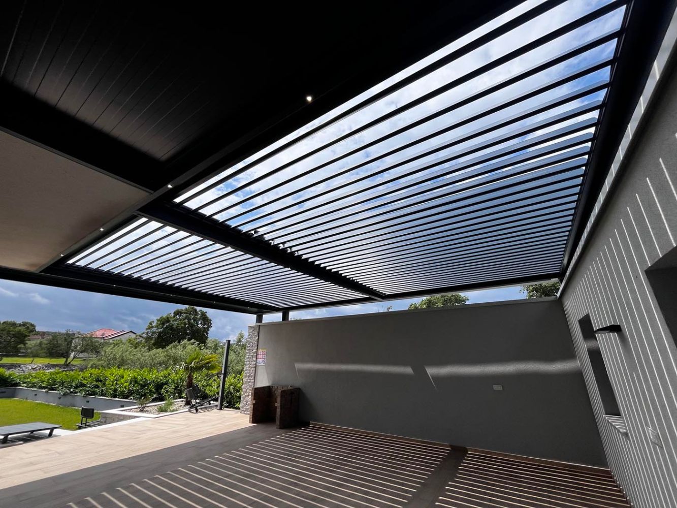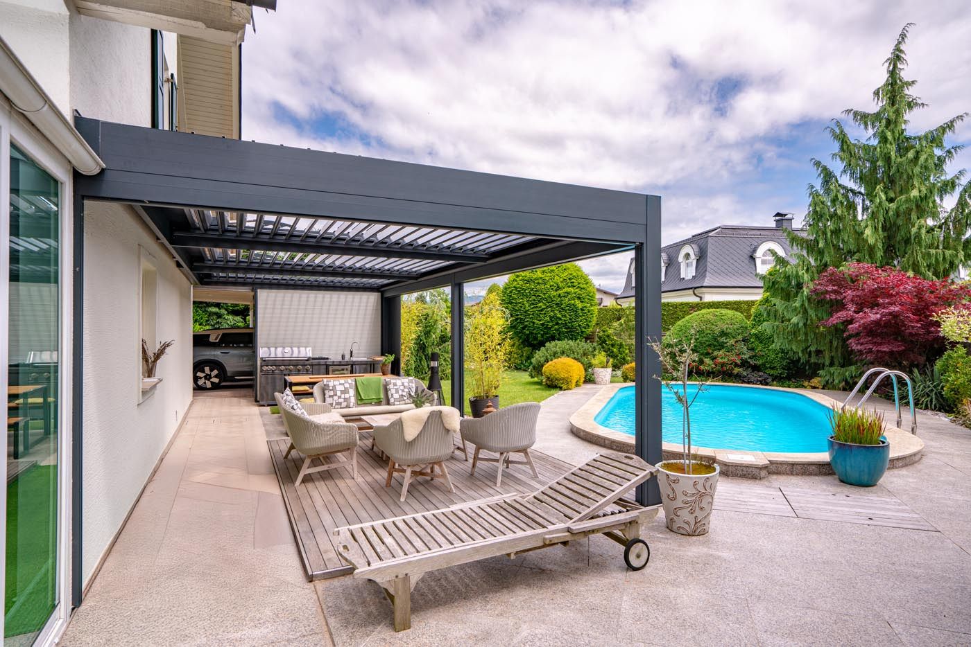 Na terasi ob bazenu stoji elegantna bioklimatska pergola v antracit barvi (RAL 7016), ki prostoru dodaja moderen pridih ter hkrati nudi funkcionalno zaščito pred vremenskimi vplivi.