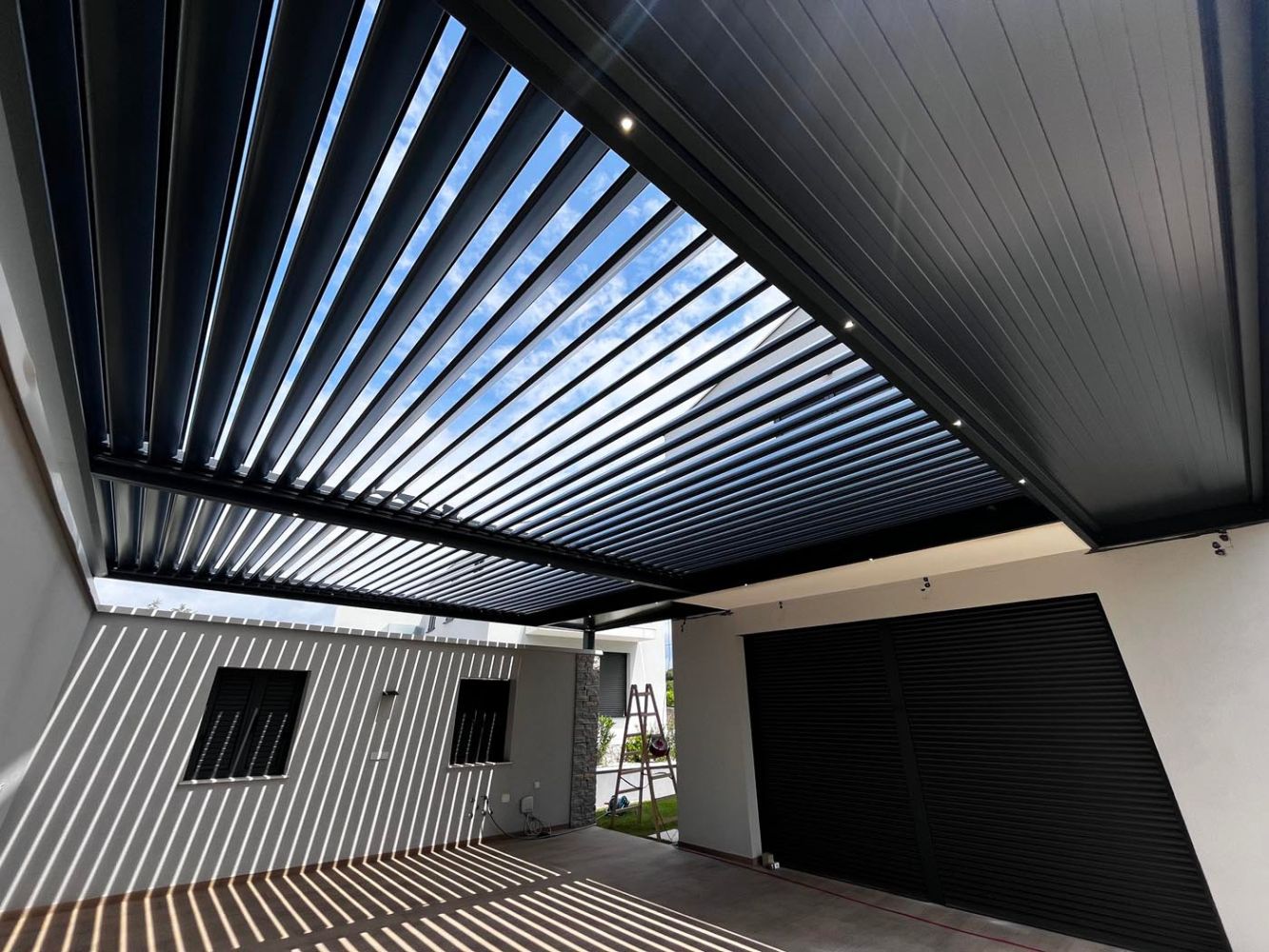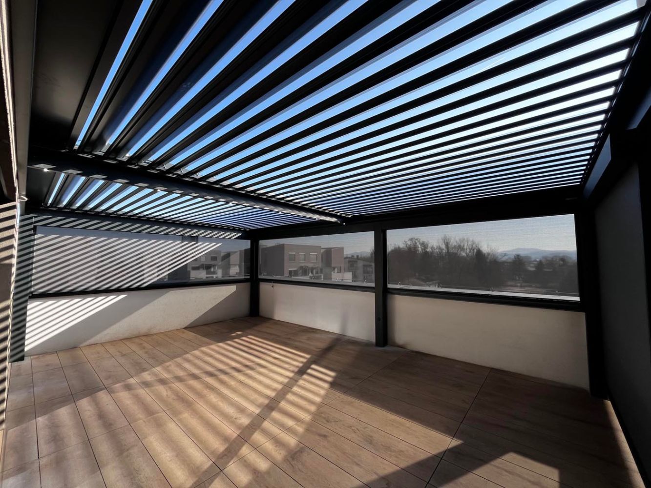 Pergola je razdeljena na tri dele. Dve polji sta bioklimatski, z vzporednimi lamelami, ki omogočajo rotacijo do 160° za optimalno senčenje in prezračevanje. Tretji, nekoliko manjši del pa je izveden iz aluminijastih fiksnih panelov, ki zagotavljajo stalno zaščito in dopolnjujejo celoten videz pergole.