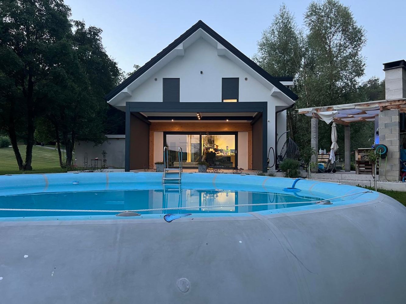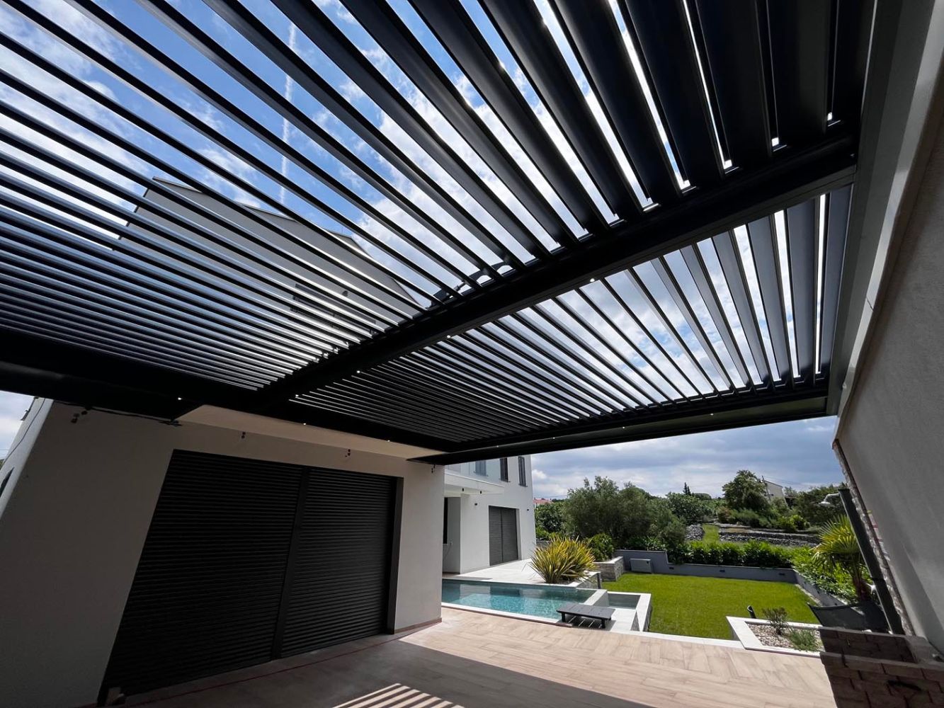 Ob bazenu na terasi novogradnje stoji bioklimatska pergola, ki je zasnovana v kombinaciji antracitne konstrukcije (RAL 7016) in belih lamel (RAL 9010), kar ustvarja čist, moderen videz, ki se lepo ujema z arhitekturo objekta.