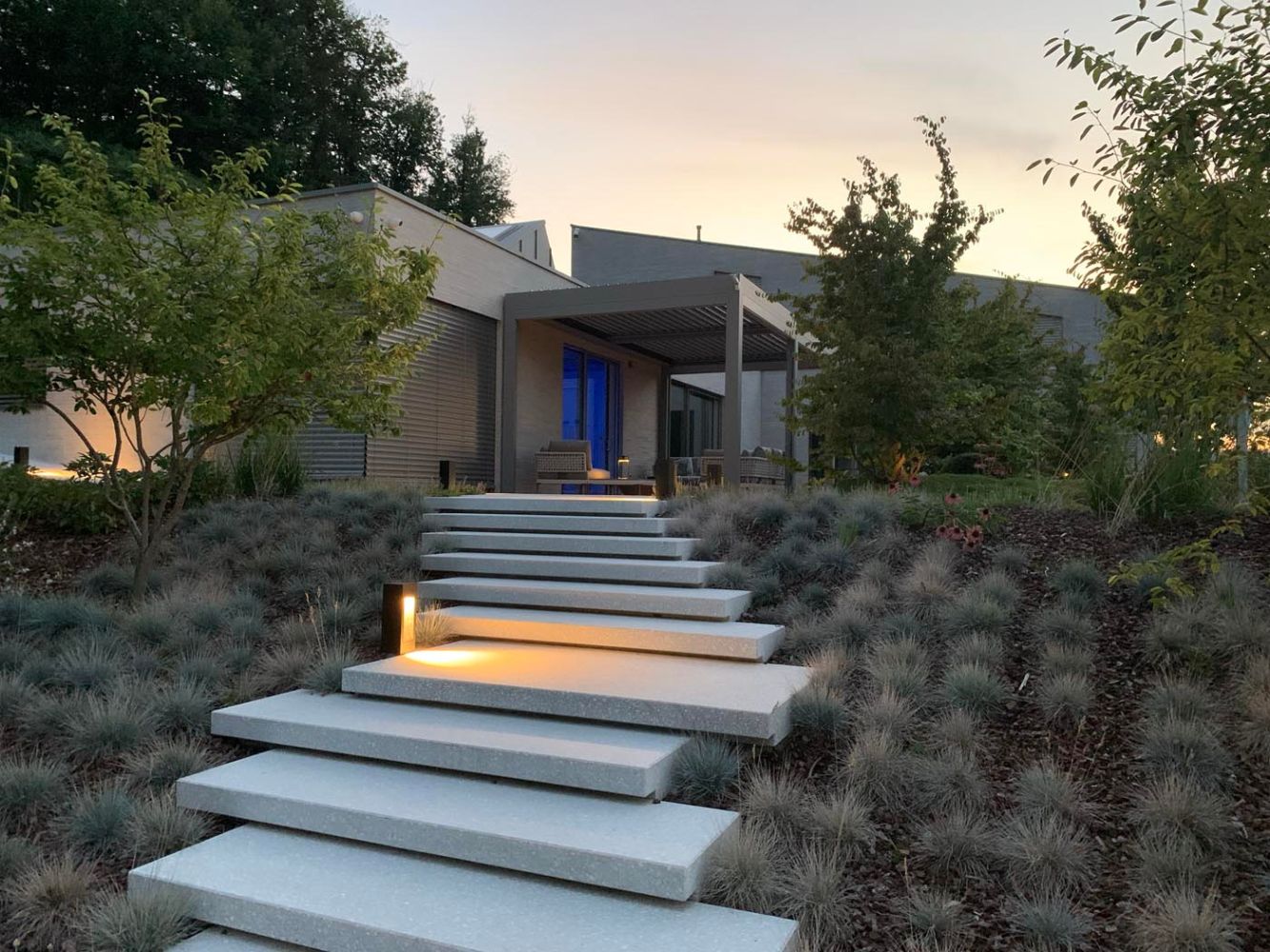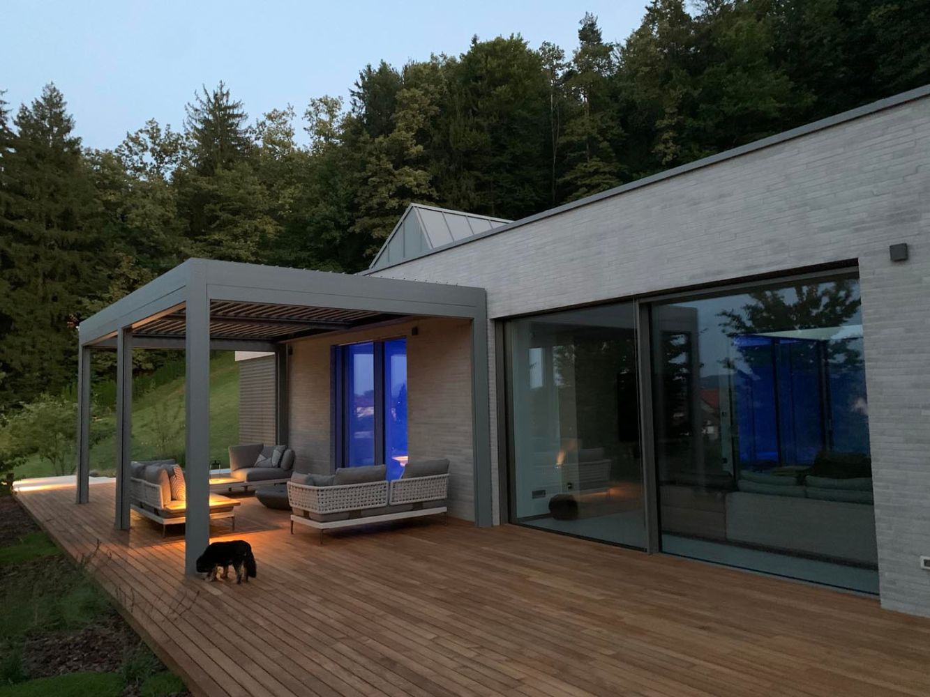 Za prijetno vzdušje tudi po sončnem zahodu so v pergolo vgrajene LED luči, ki ustvarjajo mehko, ambientalno osvetlitev in omogočajo uporabo terase ob vsakem času dneva.