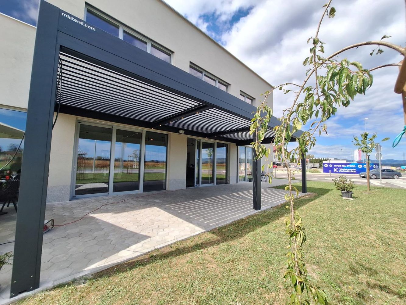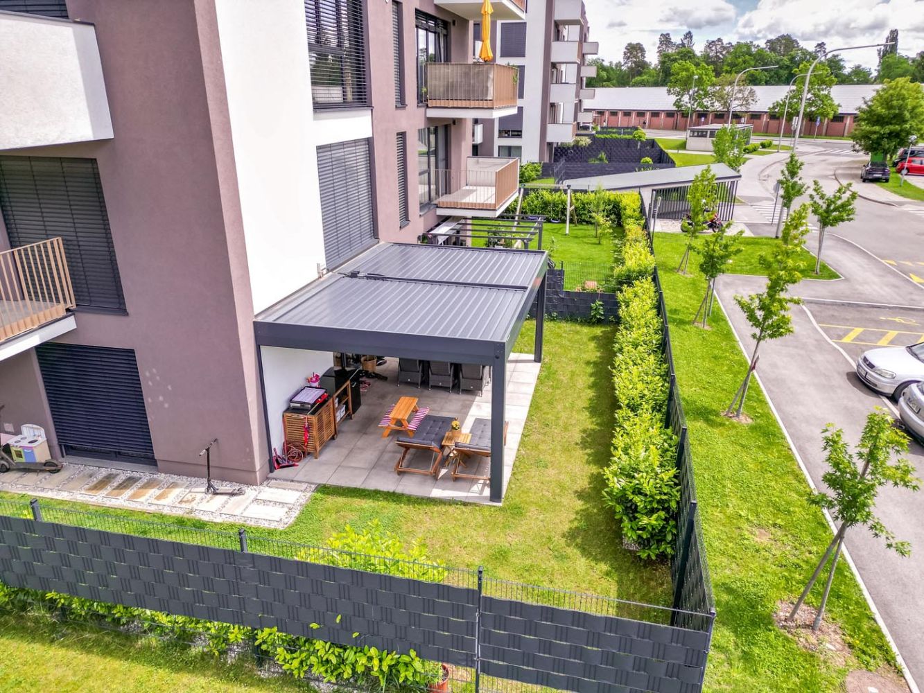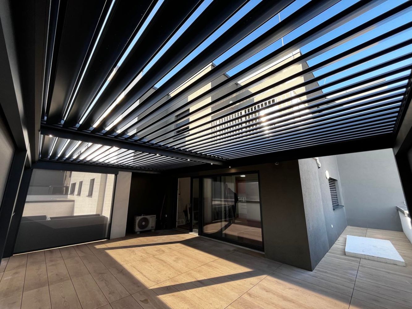 Na terasi novogradnje v Celju je postavljena bioklimatska pergola v moderni antracitni barvi (RAL 7016), ki s svojim sodobnim dizajnom odlično dopolnjuje arhitekturo objekta.