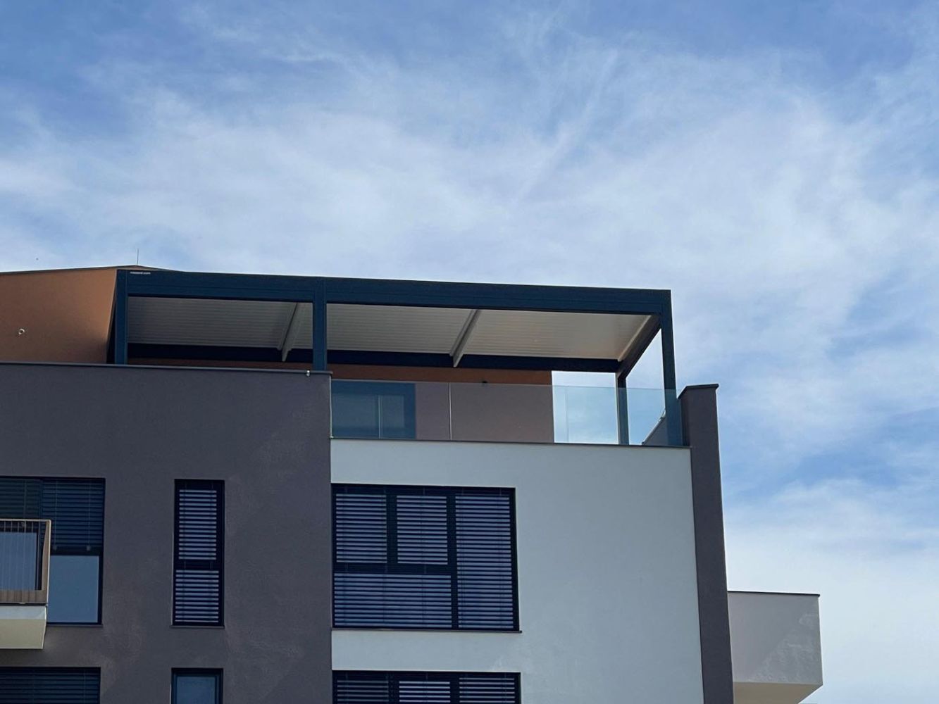 Na zgornji terasi sodobnega večstanovanjskega objekta na Štajerskem je postavljena bioklimatska pergola v elegantni kombinaciji antracitne (RAL 7016) konstrukcije in belih lamel (RAL 9010).