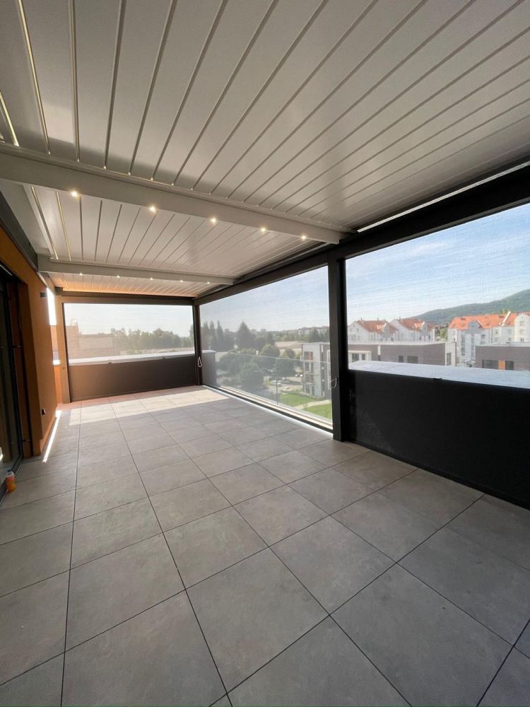 Na daljši stranici sta vgrajena dva ZIP screen roloja v ujemajočem se antracit odtenku, ki nudita zaščito pred vetrom, soncem in pogledi, medtem ko integrirane LED luči poskrbijo za prijetno osvetlitev in uporabo terase tudi v večernih urah.