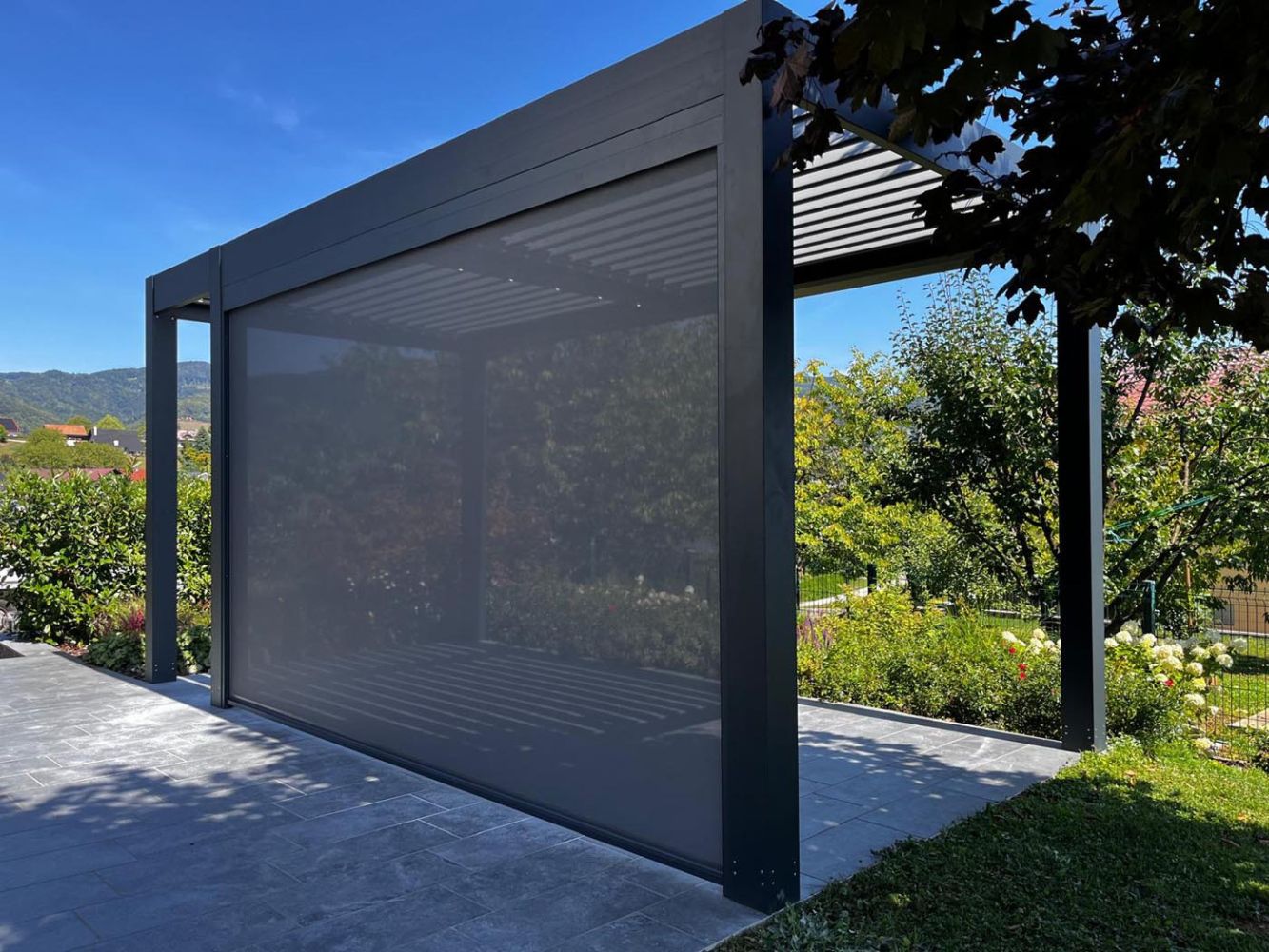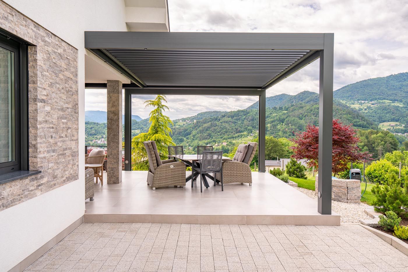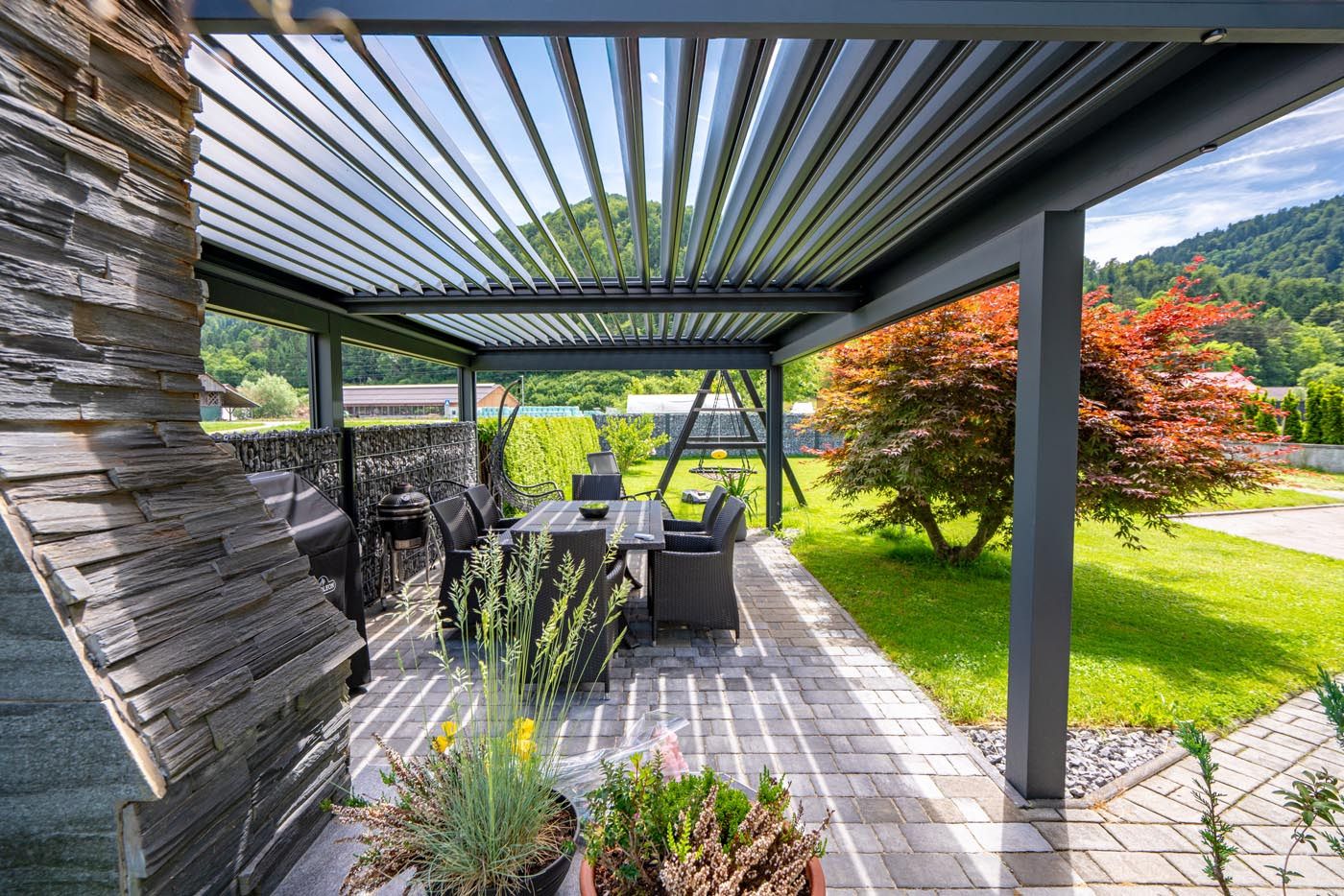 Na prostorni terasi stoji večja bioklimatska pergola v elegantni antracitni barvi (RAL 7016).