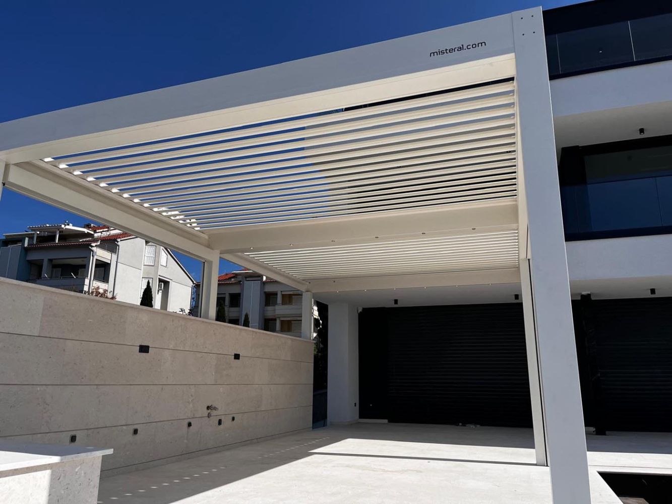 Na krasni, elegantni in moderni terasi novogradnje stoji bioklimatska pergola v svežem belem odtenku (RAL 9010), ki se odlično sklada s sodobno arhitekturo objekta.
