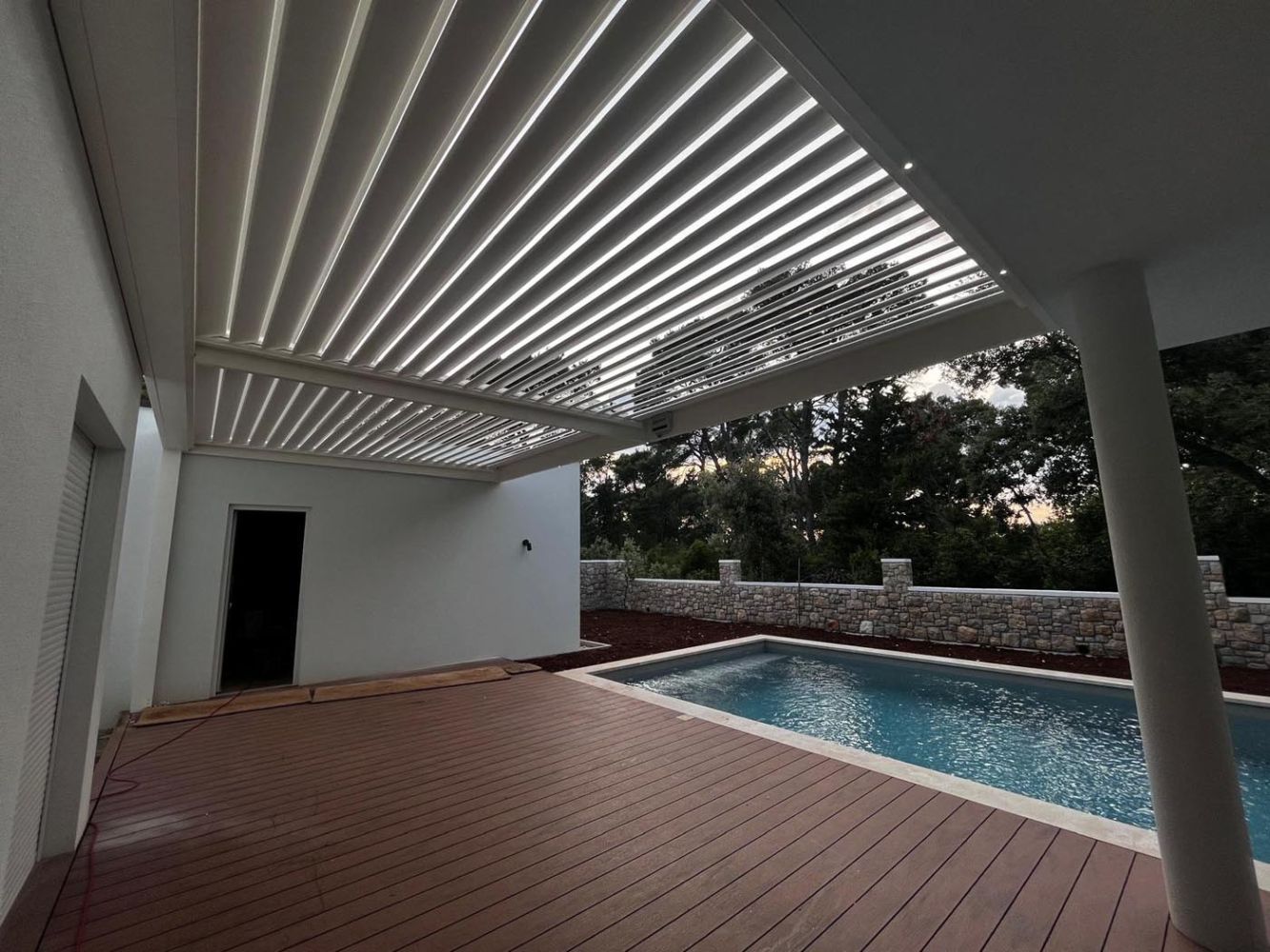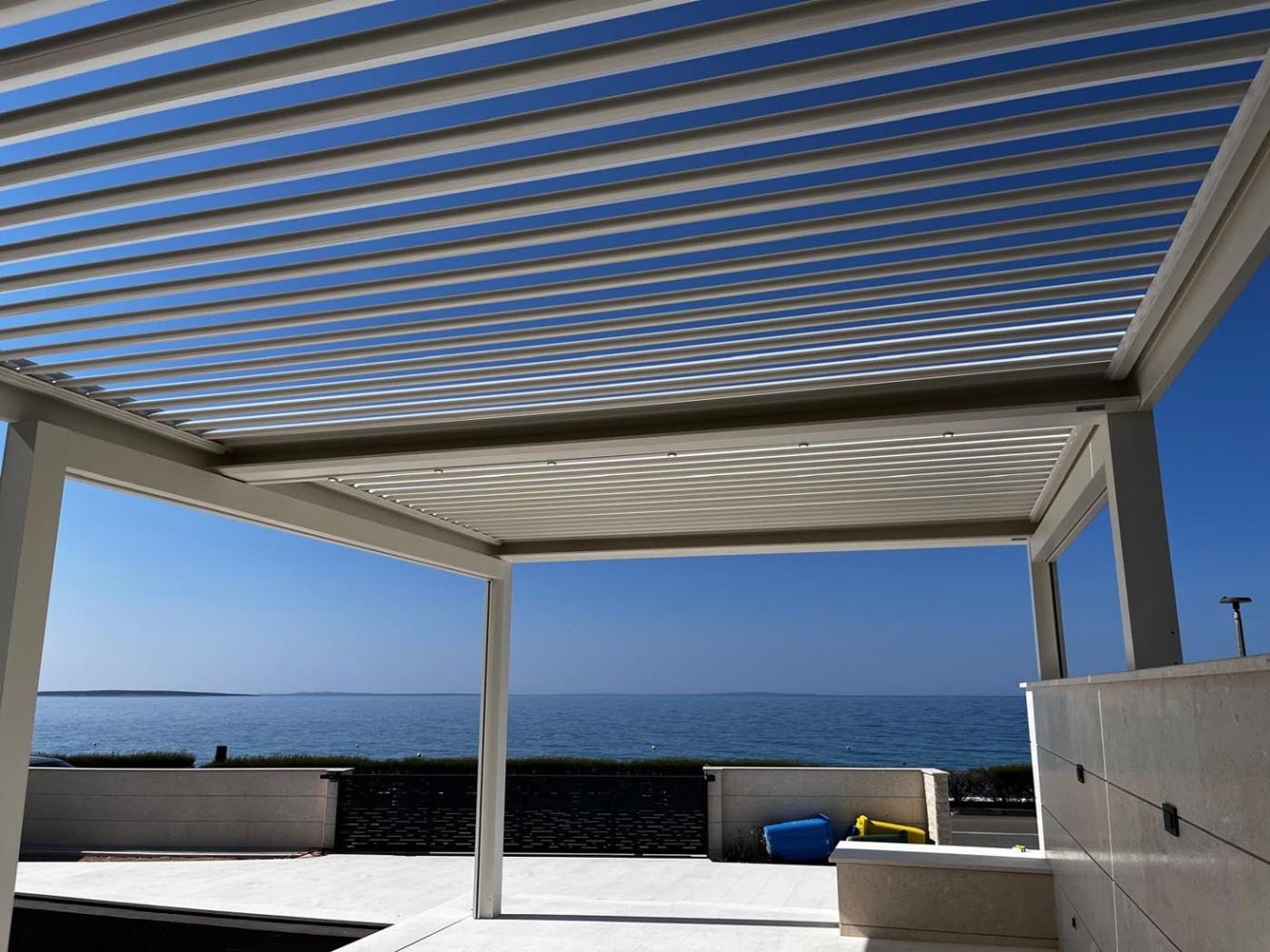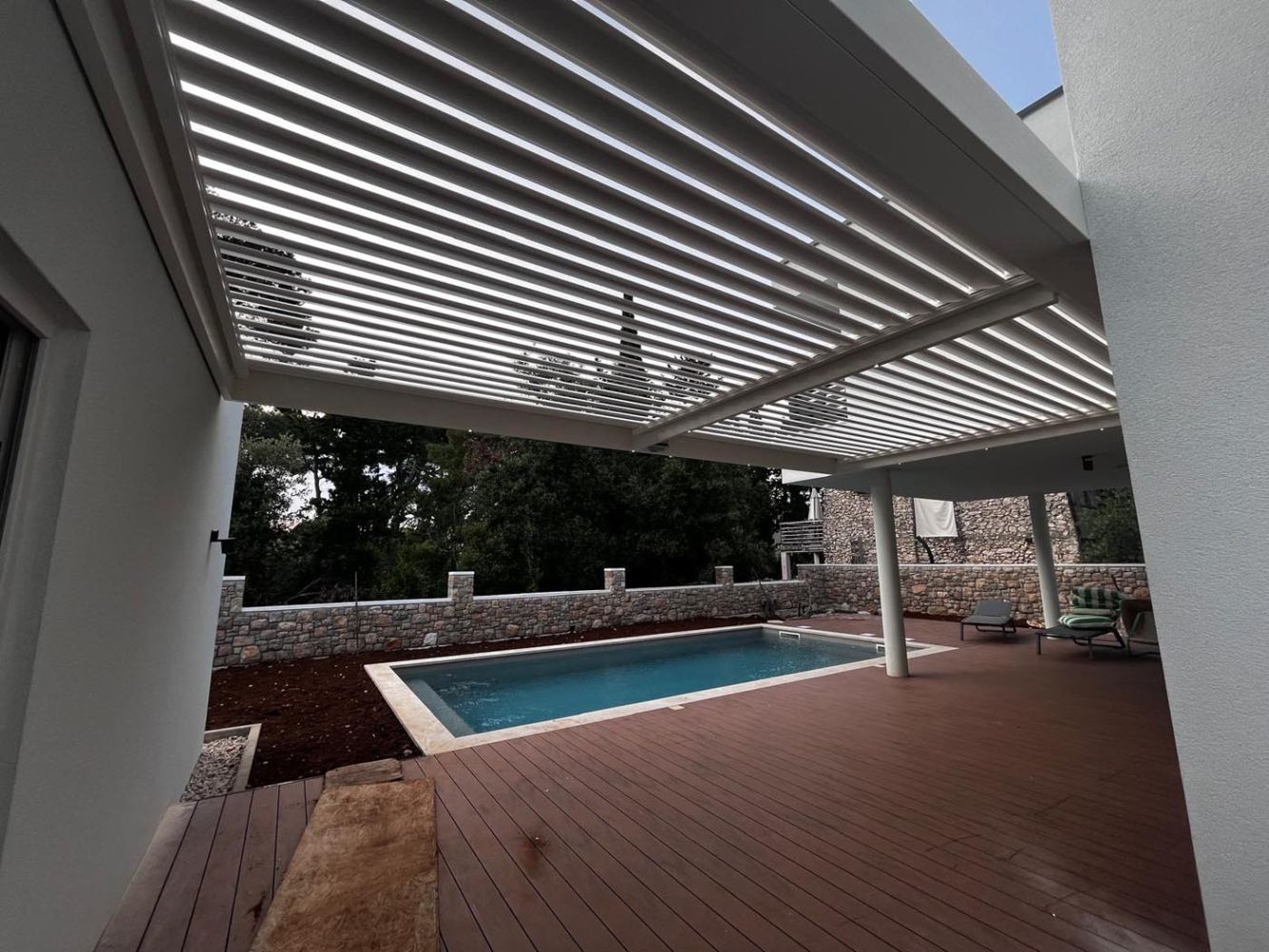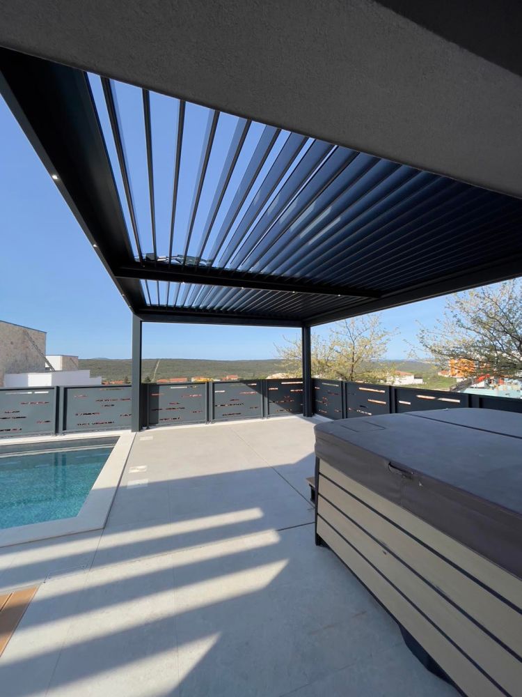 Na prostorni terasi ob bazenu je nameščena bioklimatska pergola v elegantnem belem odtenku (RAL 9010), ki s svojo svežino in čistimi linijami ustvarja sodoben videz, popolnoma primeren za obmorsko okolje.