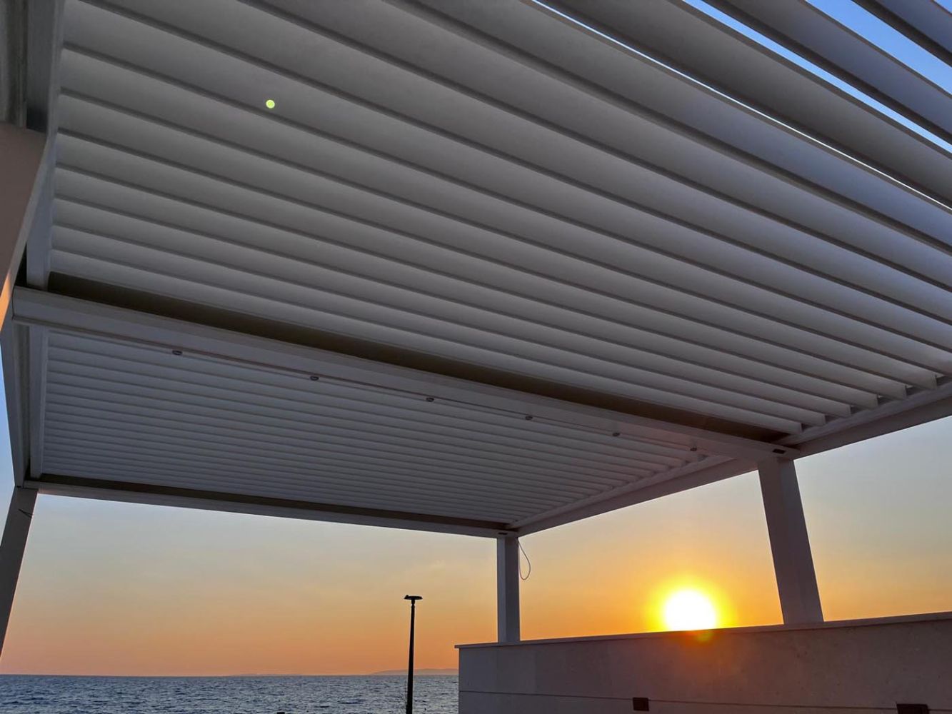 Sestavljena je iz kar 18 polj vzporednih lamel, ki omogočajo rotacijo do 160°, kar pomeni popolno prilagodljivost glede na sonce, veter ali dež. Tako lahko gostje uživajo na zunanji terasi ne glede na vremenske razmere – naj gre za sončen dan, veter ali poletno ploho.