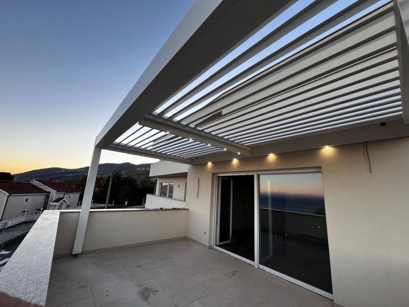 Na balkonski terasi v Opatiji stoji bioklimatska pergola, ki s svojo svežo belo barvo (RAL 9010) čudovito dopolnjuje morsko okolje in arhitekturo obmorskega objekta. Svetel ton pergole prispeva k zračnemu in sodobnemu videzu terase, ki postane popoln prostor za sprostitev skozi vse leto.