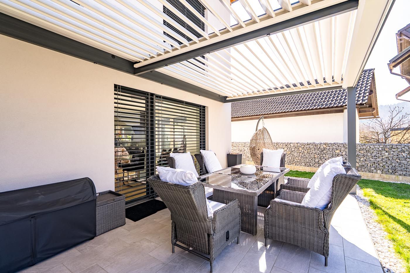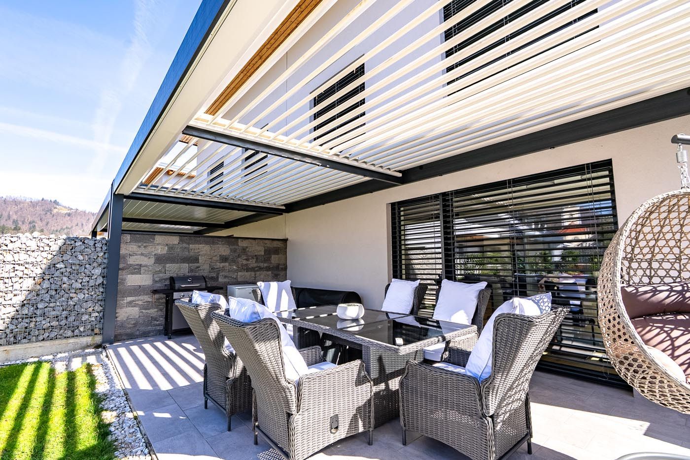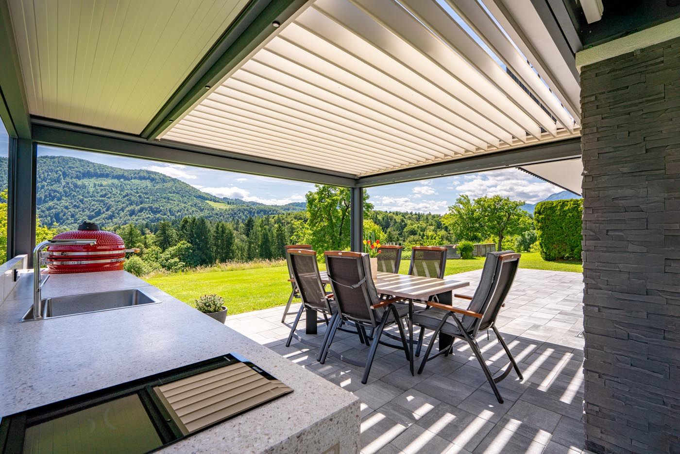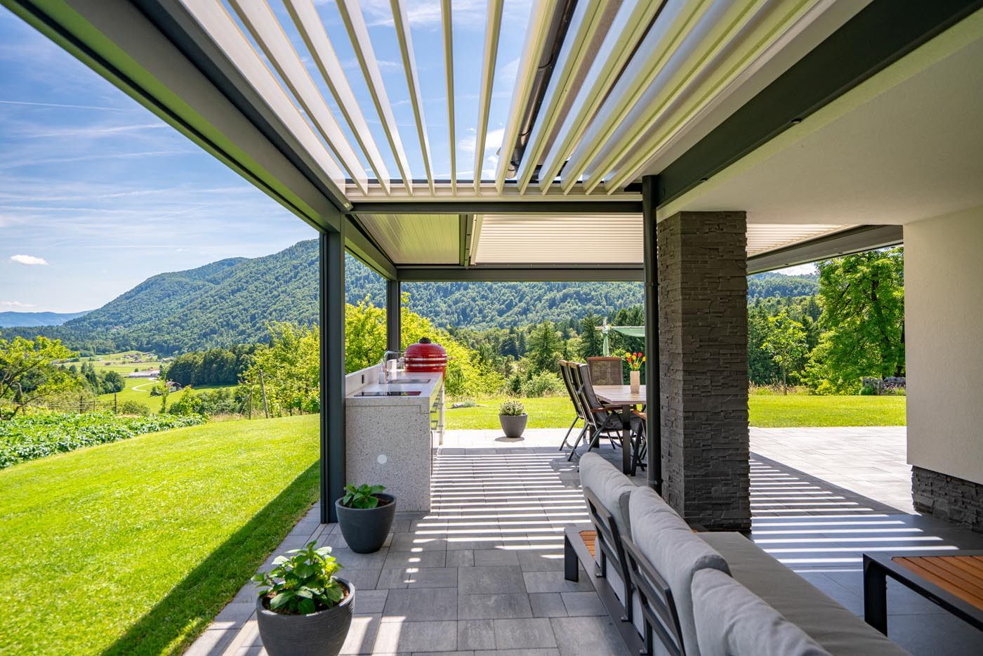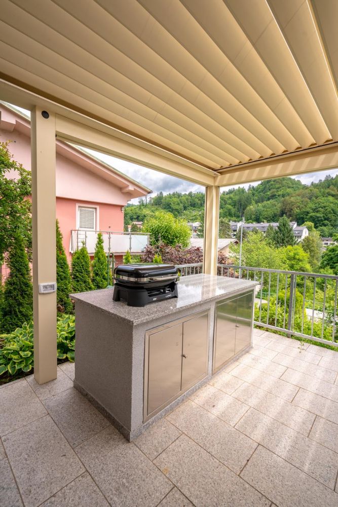Na čudoviti terasi ob hiši stoji bioklimatska pergola, ki s svojo kombinacijo antracitne konstrukcije (RAL 7016) in belih lamel (RAL 9010) ustvarja eleganten in sodoben zunanji prostor. S svojo funkcionalnostjo pokriva tudi letno kuhinjo, kar omogoča nemoteno druženje v vsakem vremenu – od vročih poletnih dni do deževnih večerov.