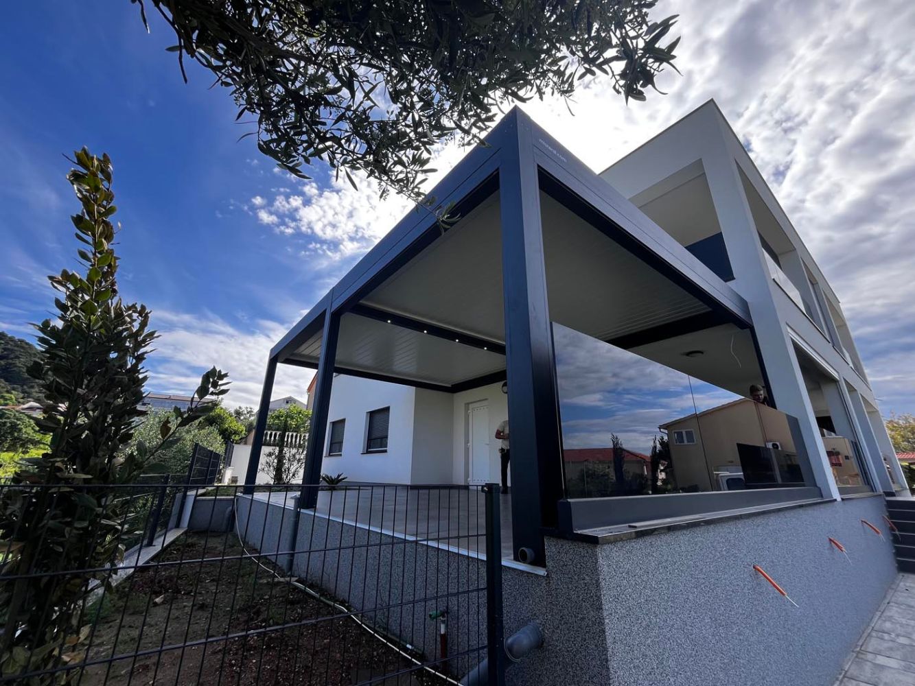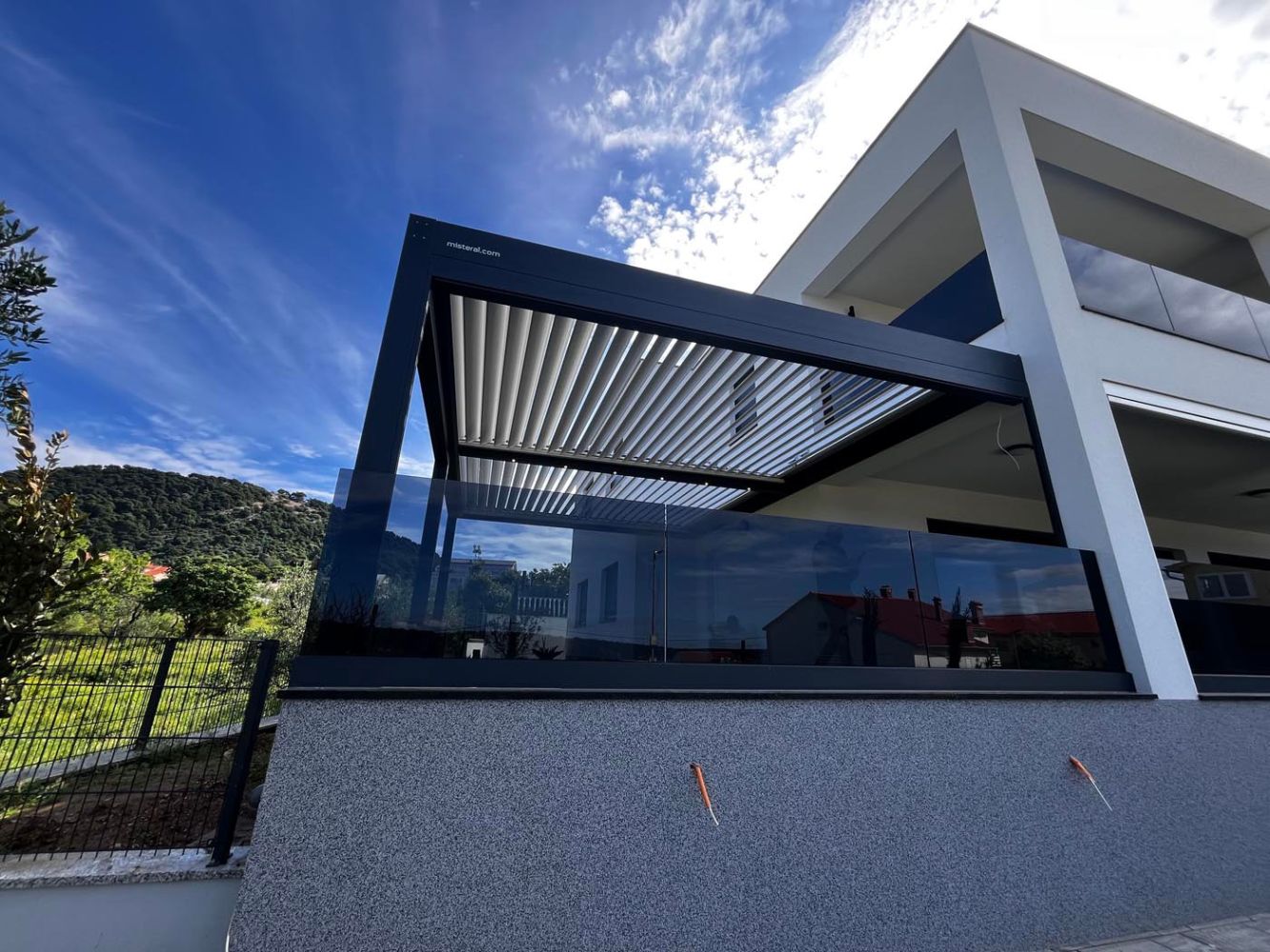 Poseben arhitekturni poudarek predstavlja dodatna aluminijasta konstrukcija, vgrajena na drugi strani terase. Ta element deluje kot moderen vizualni dodatek, popolnoma usklajen tako z bioklimatsko pergolo kot z arhitekturo objekta. Dodatna konstrukcija je podprta s tremi stebri, kar zagotavlja stabilnost in poudarja njeno funkcionalno vlogo.