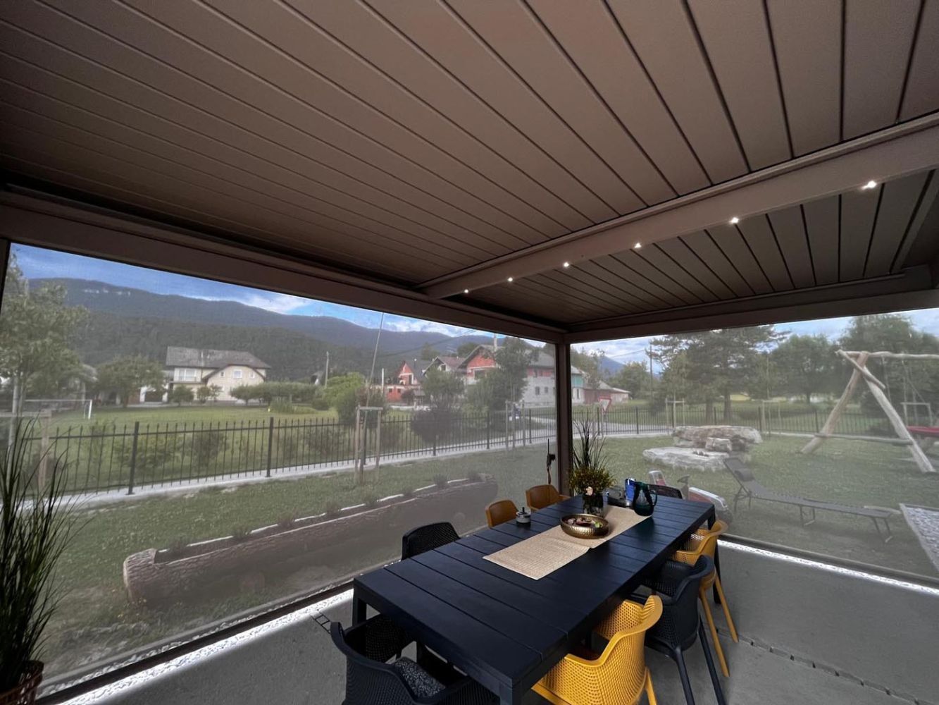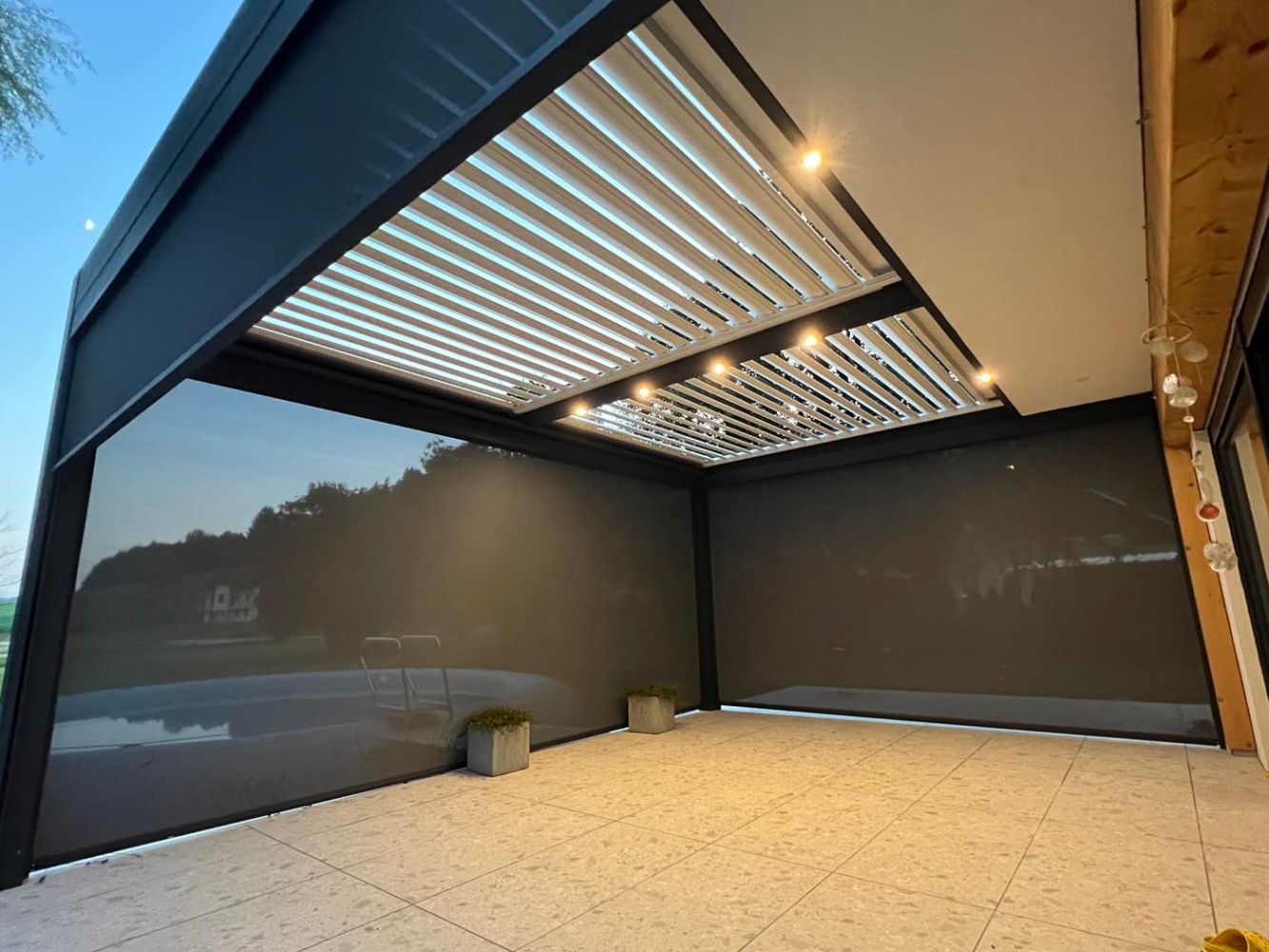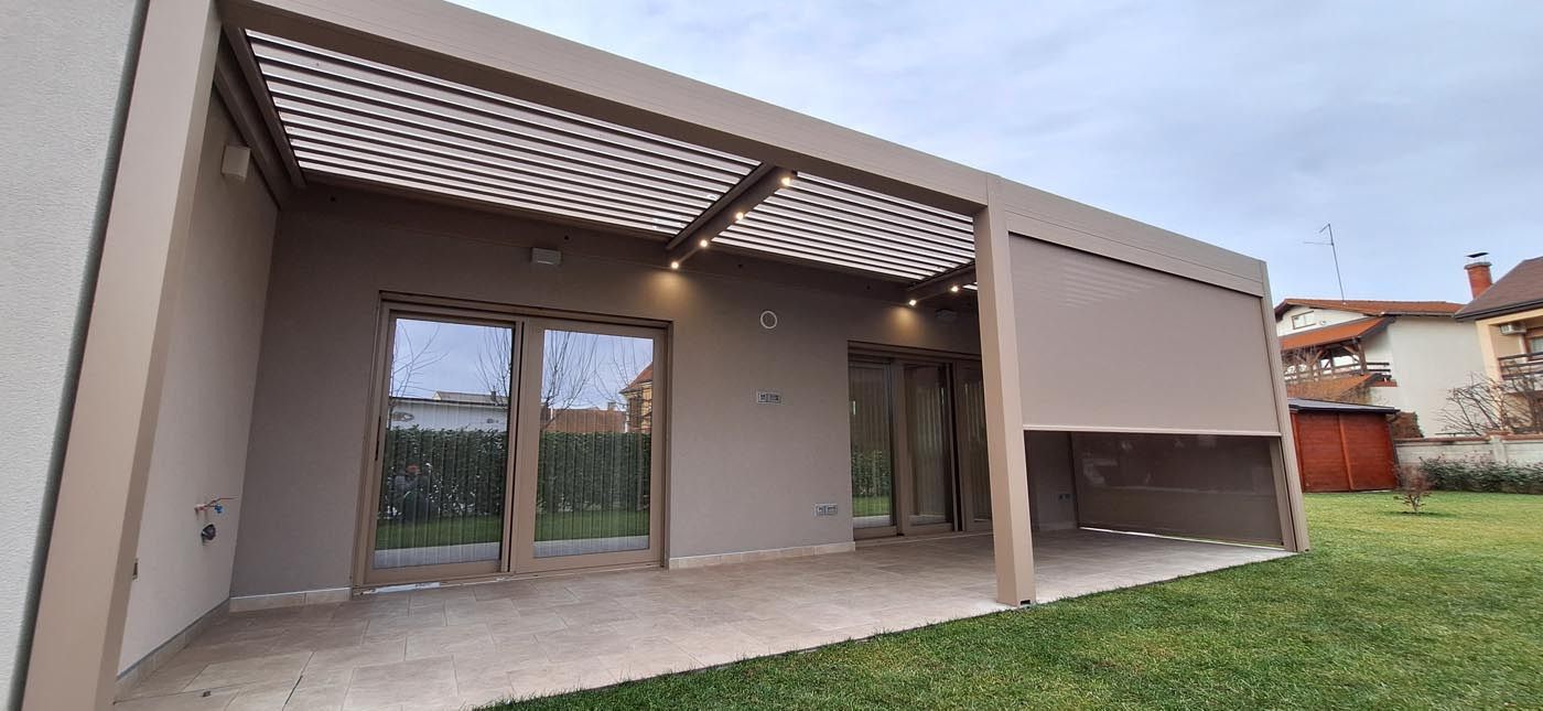 Za večje udobje in podaljšanje uporabe pergole tudi v večernih urah so v konstrukcijo vgrajene LED luči, ki ustvarjajo prijetno in ambientalno osvetlitev. Poleg tega so nameščeni trije zip screen roloji, ki dodatno pripomorejo k zasebnosti in zaščiti ter omogočajo popolno zaprtje pergole po potrebi.