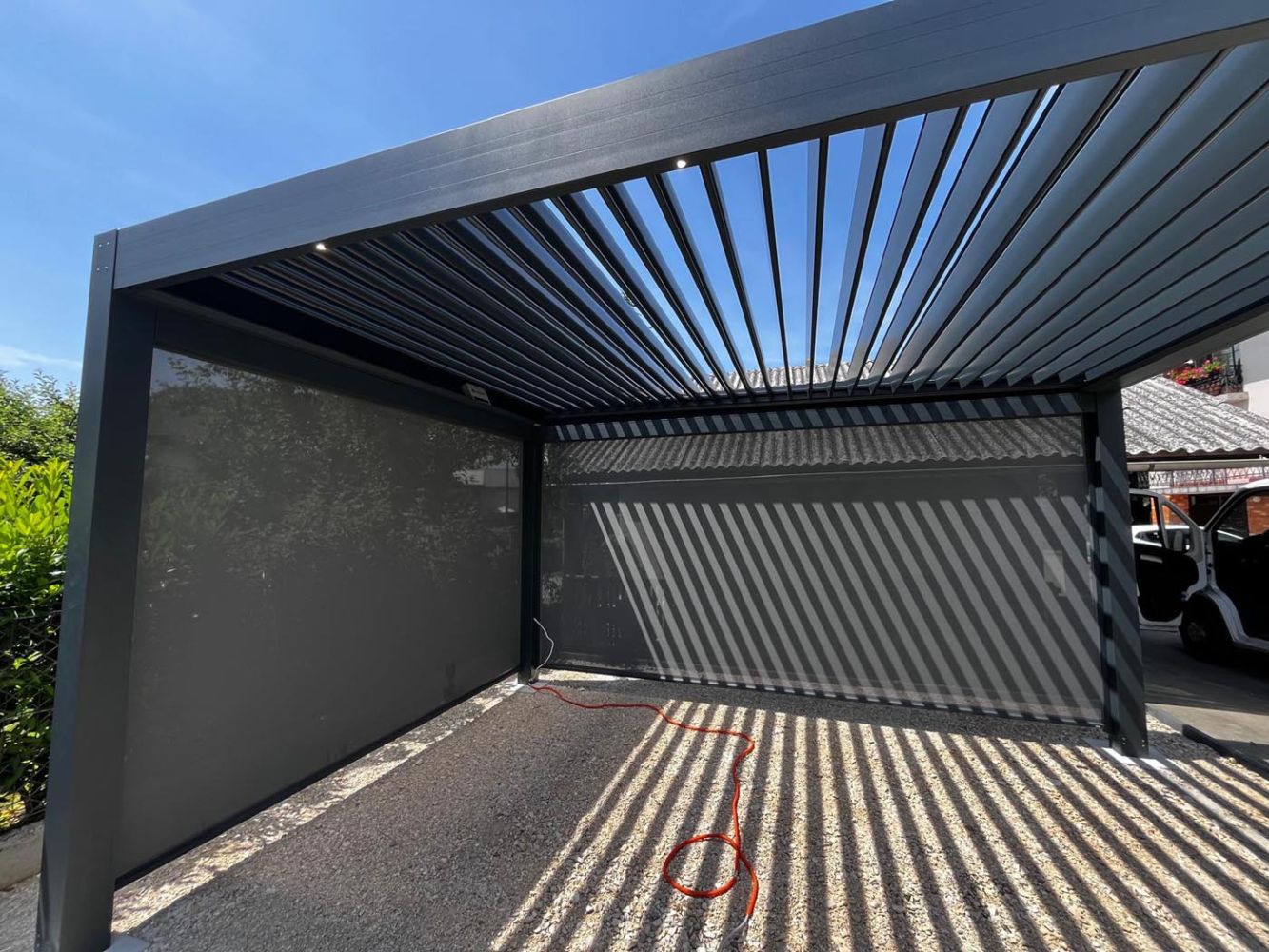Pergola je sestavljena iz dveh polj vzporednih lamel, ki se lahko rotirajo do 160°, kar omogoča prilagodljivo senčenje, učinkovito zračenje in zaščito pred soncem ali dežjem. Na eni strani je vpeta v objekt, na drugi strani pa podprta z dvema stebroma.