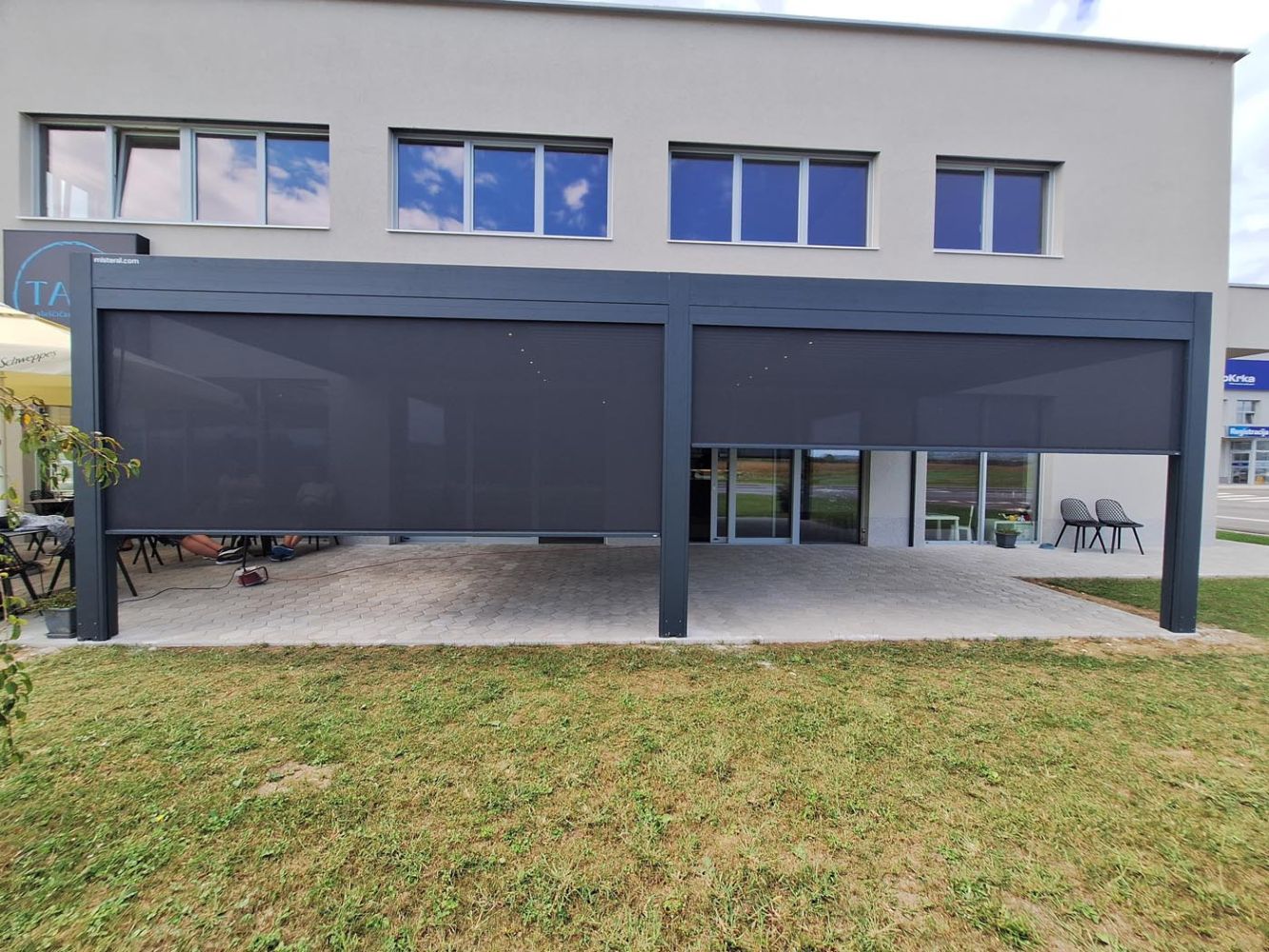 Bioklimatska pergola na terasi gostinskega lokala TACA v Brežicah predstavlja popoln stik sodobne arhitekture in funkcionalnega oblikovanja. Izvedena je v elegantnem antracitnem odtenku RAL 7016, ki se odlično ujema z moderno zasnovo nove stavbe ter prostoru doda pridih prestiža in urejenosti.