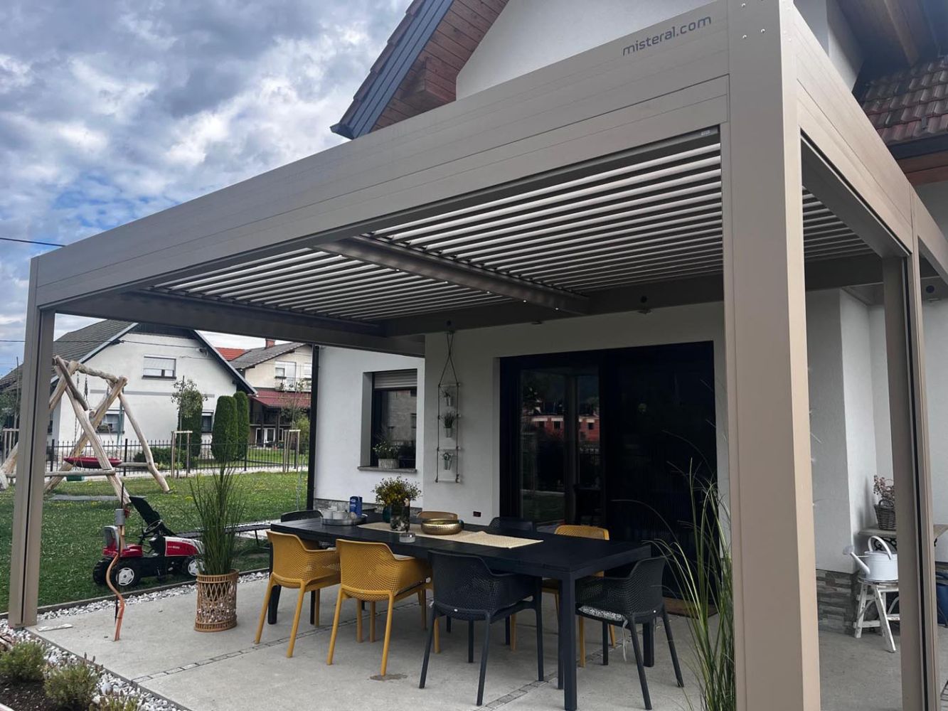 Na terasi hiše stoji čudovita bioklimatska pergola v toplih, ki prostoru doda tako estetsko vrednost kot funkcionalnost. Konstrukcija je v elegantnem čokoladno rjavem odtenku RAL 8028, medtem ko bež lamele RAL 9002 ustvarjajo prijeten barvni kontrast.