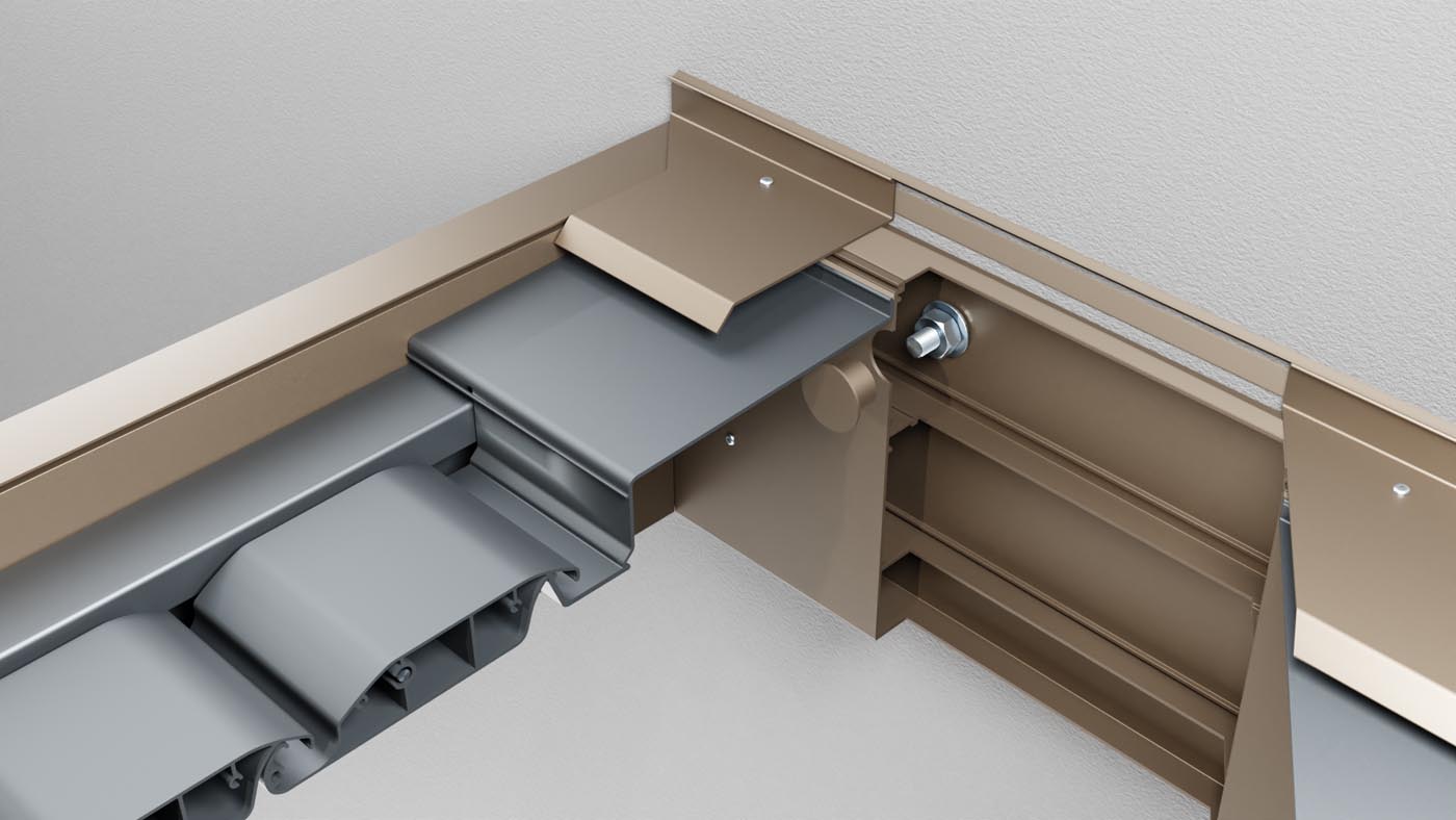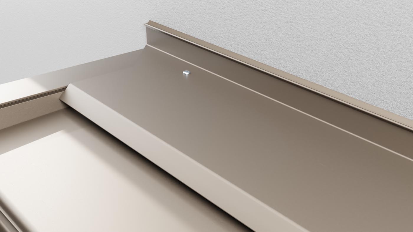 To prevent water from seeping between the facade and the pergola (and leaving stains on the facade), we install a special aluminum sealing profile. This profile is tailored to the building’s specifications and ensures water flows from the facade over the pergola into the gutter, keeping the connection dry.