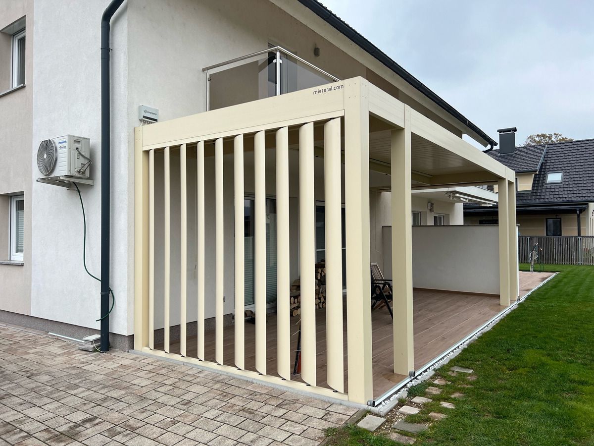 The pergola is complemented on one side with Sunbreakers B290 in soft off-white/beige (RAL 1015), creating a bright, pleasant, and elegant terrace look.