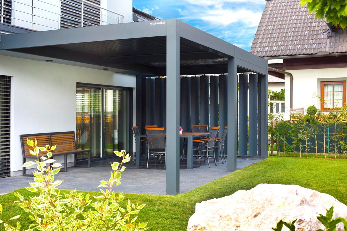 Slats are fixed or manually adjustable depending on the system, mounted on a sturdy aluminum pergola frame.