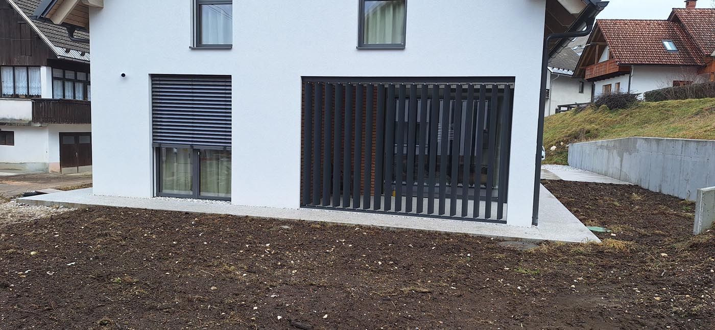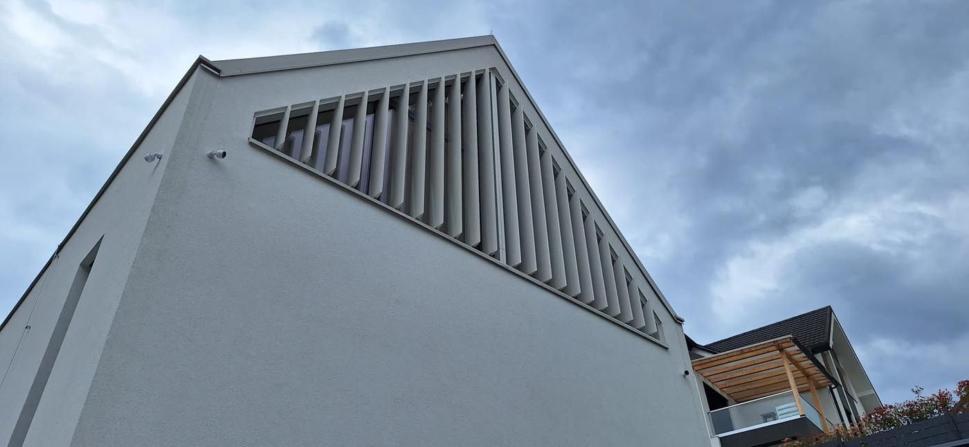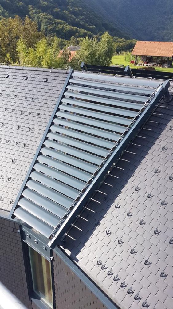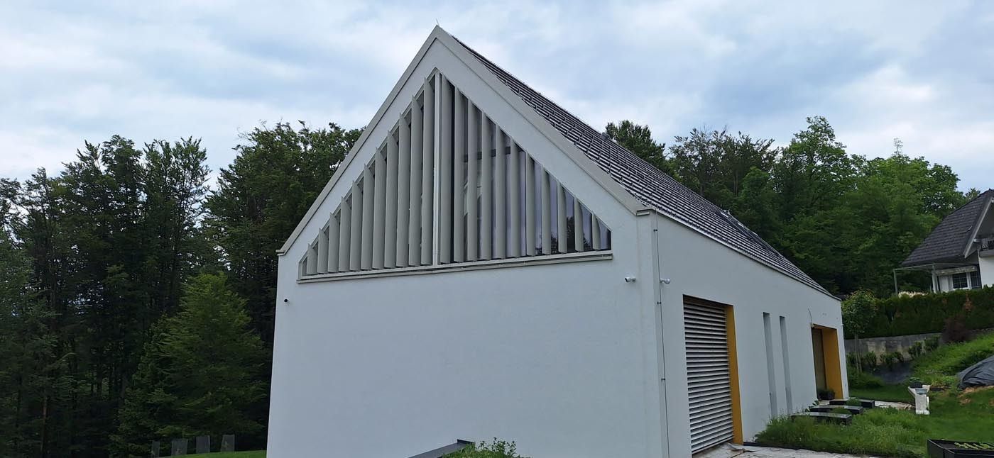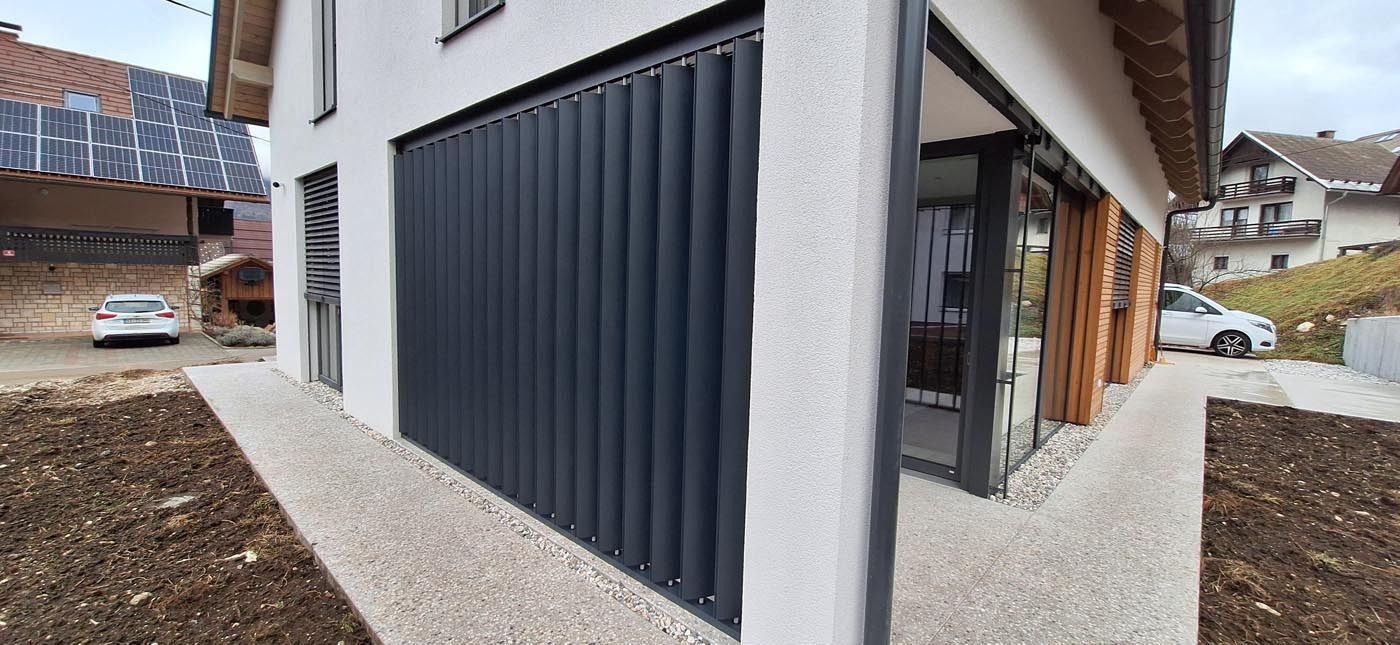 Sunbreakers B290 with 290 mm slats are installed on the roof of a new building in Trebnje, providing a beautiful addition and effective shading solution for a large roof window.