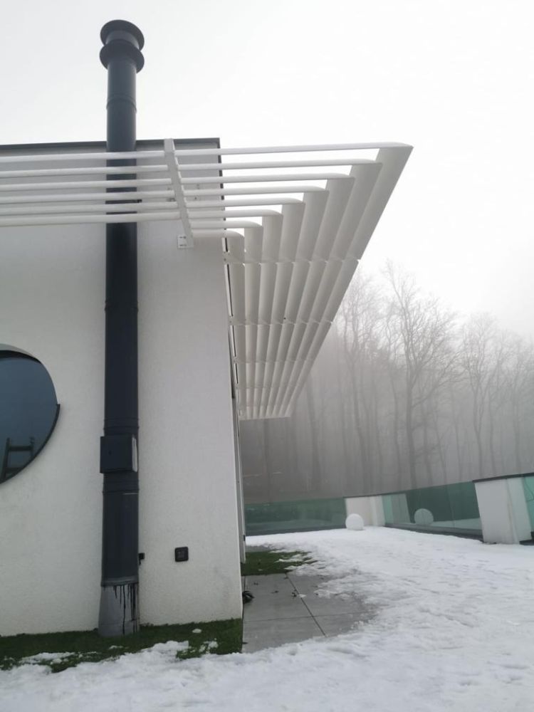 Installed on the short side of the pergola and anchored to a sturdy aluminum structure, they remain stable even in strong wind. The installation is discreet – mounted on the pergola, with the motor hidden, giving a polished, harmonious look.