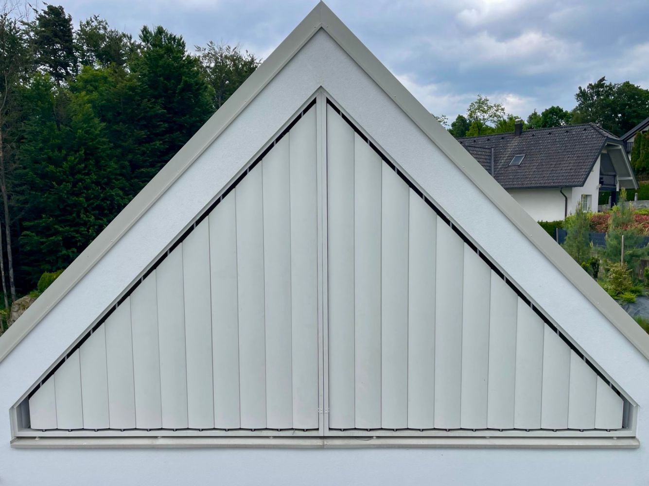 Triangular Sunbreakers are installed on a large window, finished in elegant white RAL 9010, perfectly matching the house’s color palette.