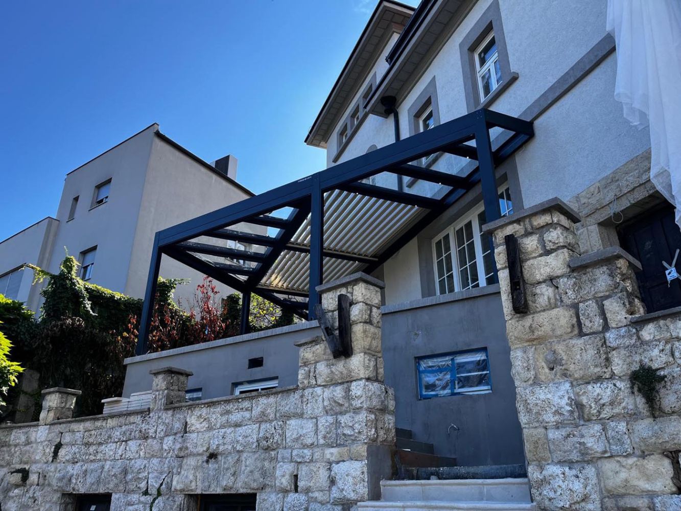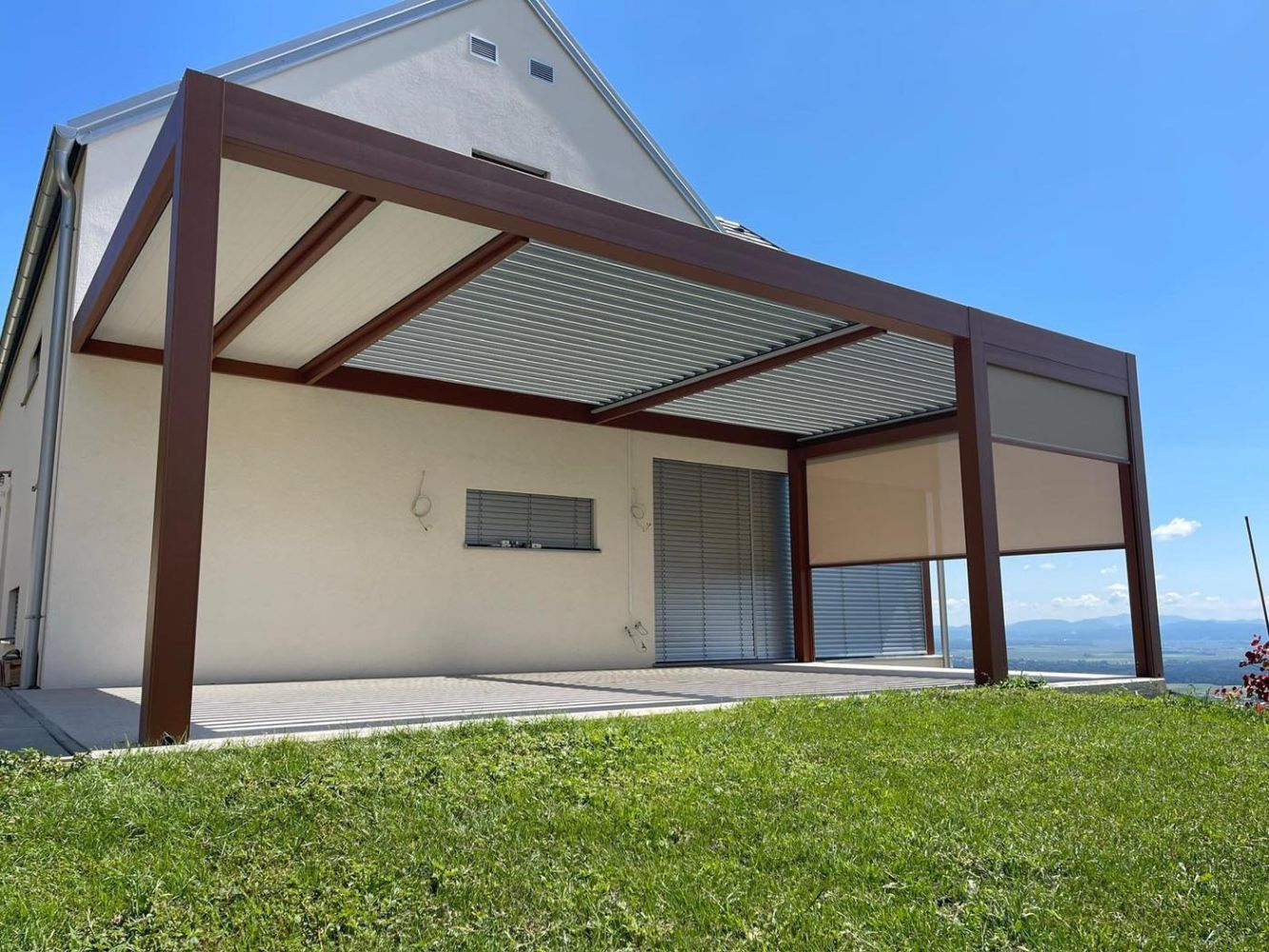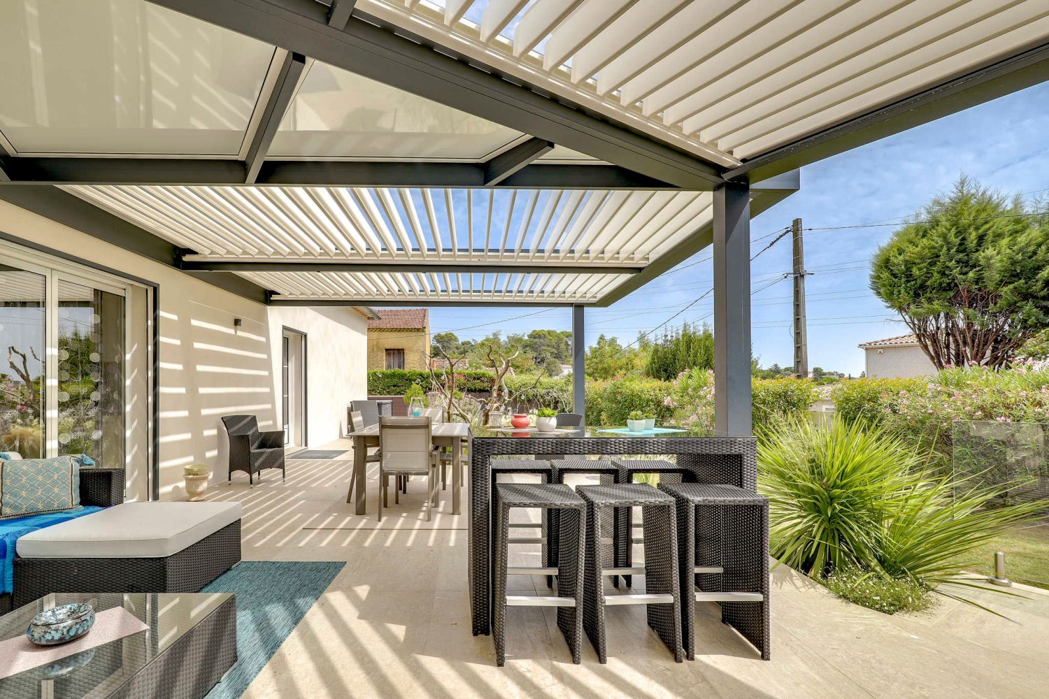 On the terrace stands a modern combination of bioclimatic and fixed pergola, combining flexibility and permanent protection.