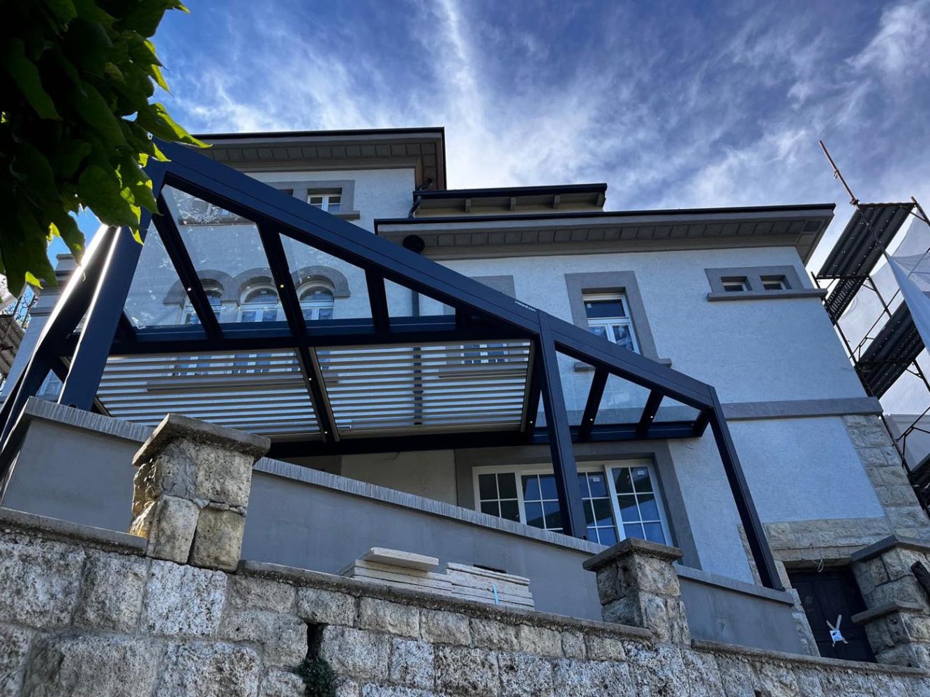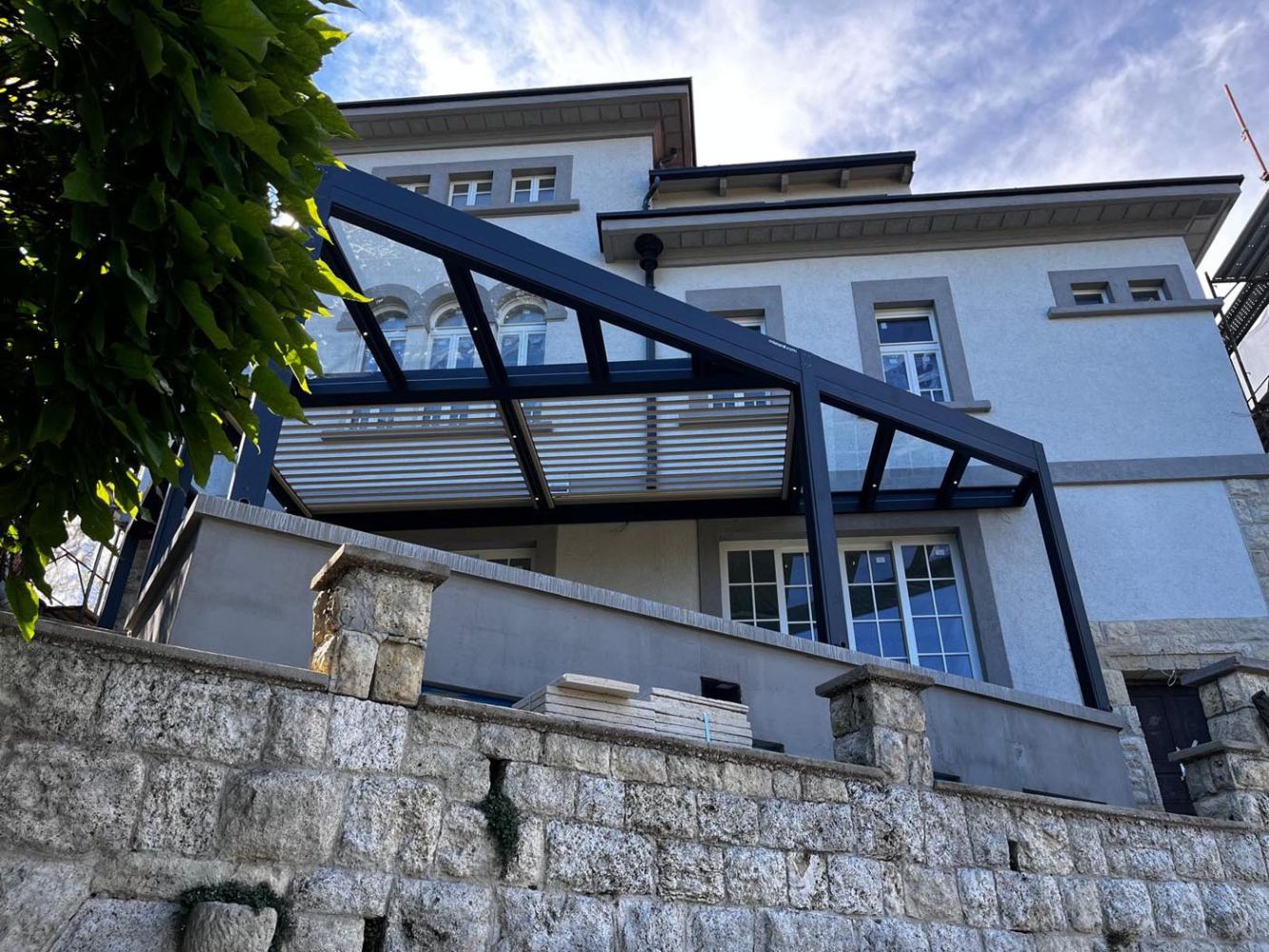 The bioclimatic part consists of two fields of parallel louvers that can rotate up to 160°, while the fixed sections are made of glass, allowing natural light while protecting against wind and rain. The glass surfaces create a distinctive aesthetic effect and give the structure lightness.