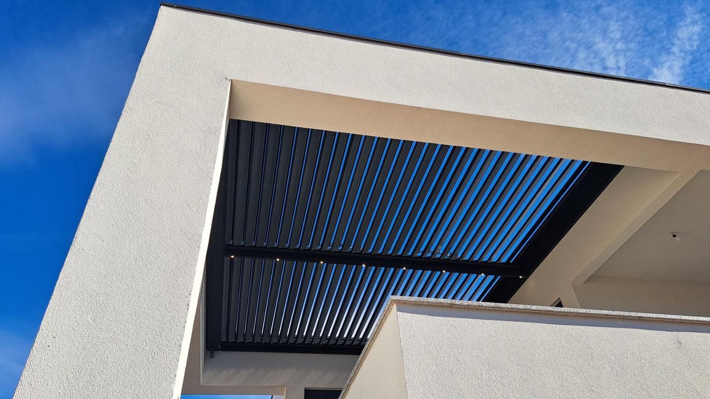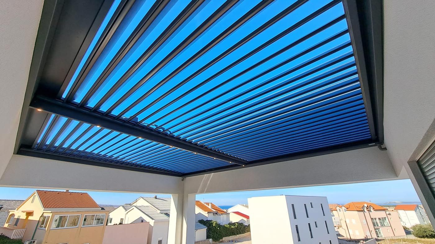 On a terrace in the Croatian capital stands an elegant integrated pergola that adds refined character with its contemporary design. Louvers are in silver RAL 9006, harmonizing with existing architecture for a modern look.