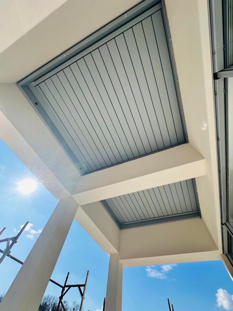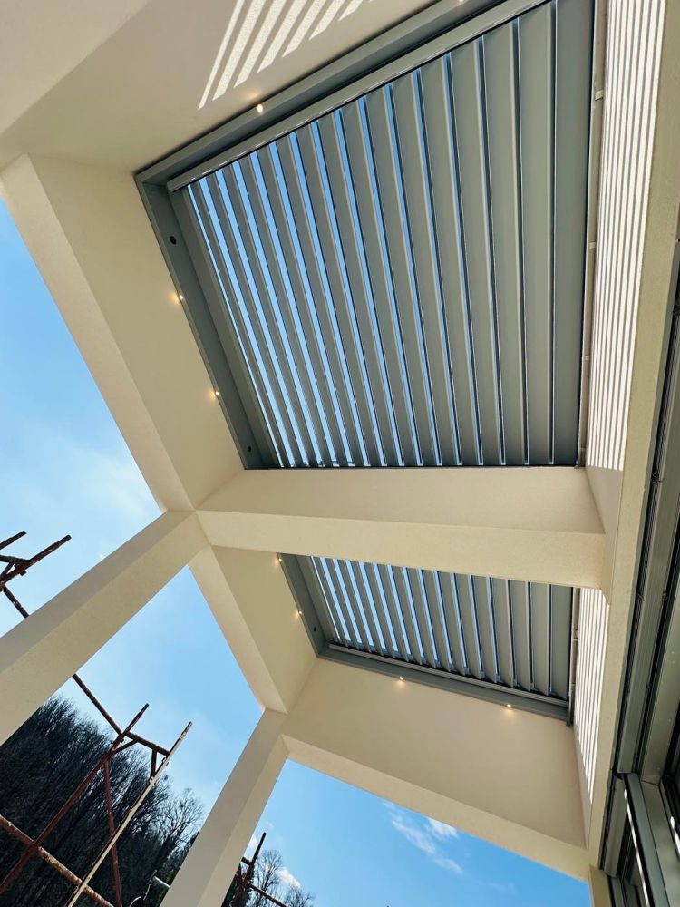 It consists of two fields of parallel louvers that can rotate up to 160°. The parallel louver arrangement allows smooth opening and closing, ensuring optimal shading, even light distribution, and effective rainwater drainage.