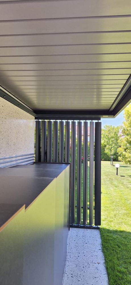 With its shape and color, the pergola creates a modern space for socializing and relaxation in all weather conditions and can also serve as car protection. It combines functionality and aesthetics, representing a true architectural highlight of the house surroundings.